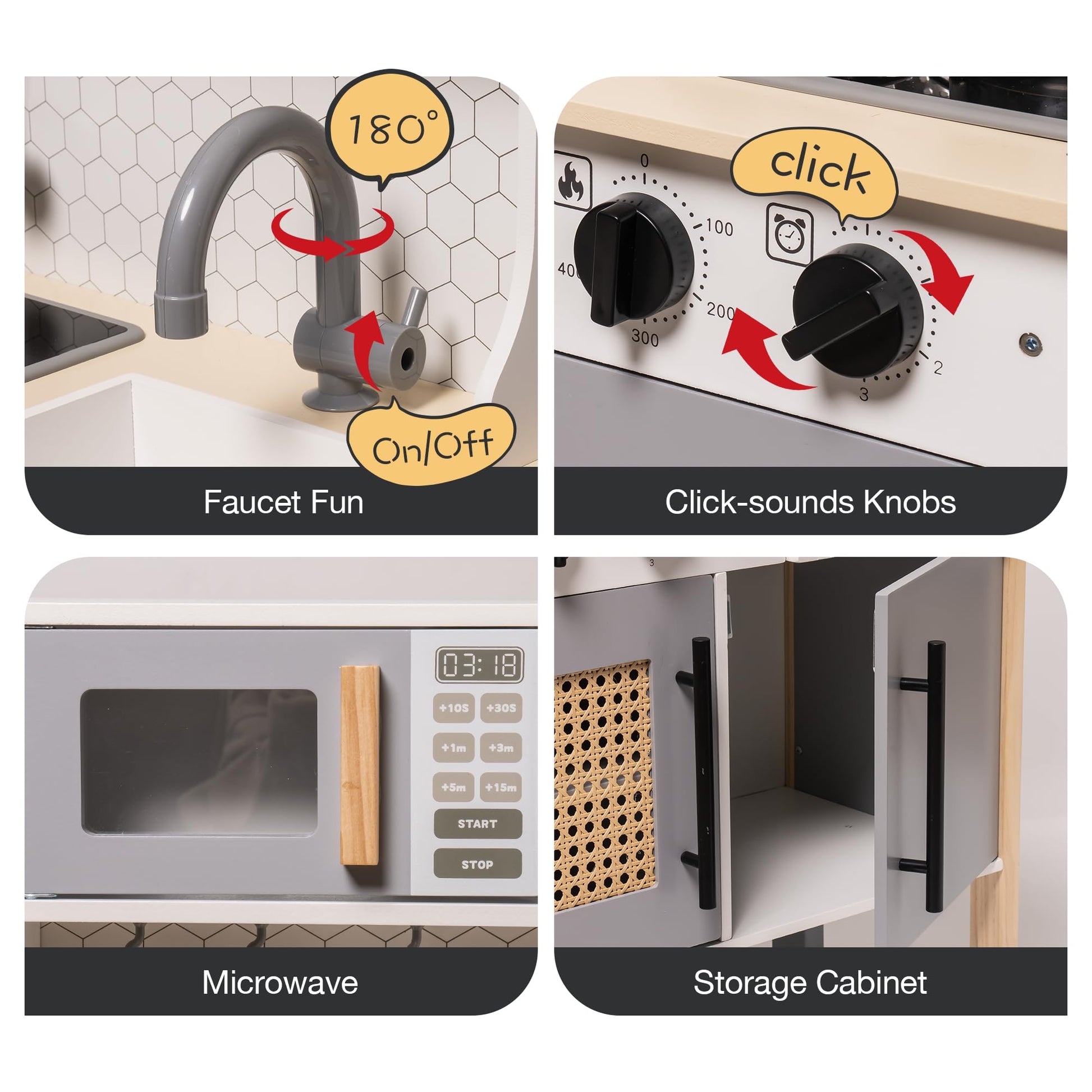 TIMELESS RETRO ELEGANCE: Immerse your child in a world of vintage charm with the ROBUD play kitchen. Its American retro design, highlighted by a gleaming golden faucet and striking gray accents, makes it a standout piece in any playroom. It's more than just a toy-it's a stylish statement. | ULTIMATE PLAY EXPERIENCE: Ignite your child's imagination with realistic sound effects from the electronic stove and tactile feedback from adjustable knobs. Every twist and turn brings the kitchen to life, offering an authentic culinary adventure that's both fun and educational. | INSPIRING GROWTH THROUGH PLAY: Let your little one step into the role of a chef, exploring the endless possibilities of creativity, imagination, and self-expression. As they cook up pretend feasts, they're also building confidence and learning valuable life skills. | CRAFTED WITH PREMIUM EXCELLENCE: The ROBUD play kitchen is meticulously constructed from top-grade wood, finished with non-toxic paint. It's not just durable-it's designed to last through years of play. Certified for safety and sturdiness, this kitchen set is as reliable as it is charming. | THE EXCITING GIFT FOR LASTING JOY: With its durable construction and thoughtfully designed accessories, the ROBUD play kitchen, measuring 23.6 x 11.8 x 36.2 inches, is the ideal gift for sparking endless hours of imaginative play and creating treasured memories that will last a lifetime.
