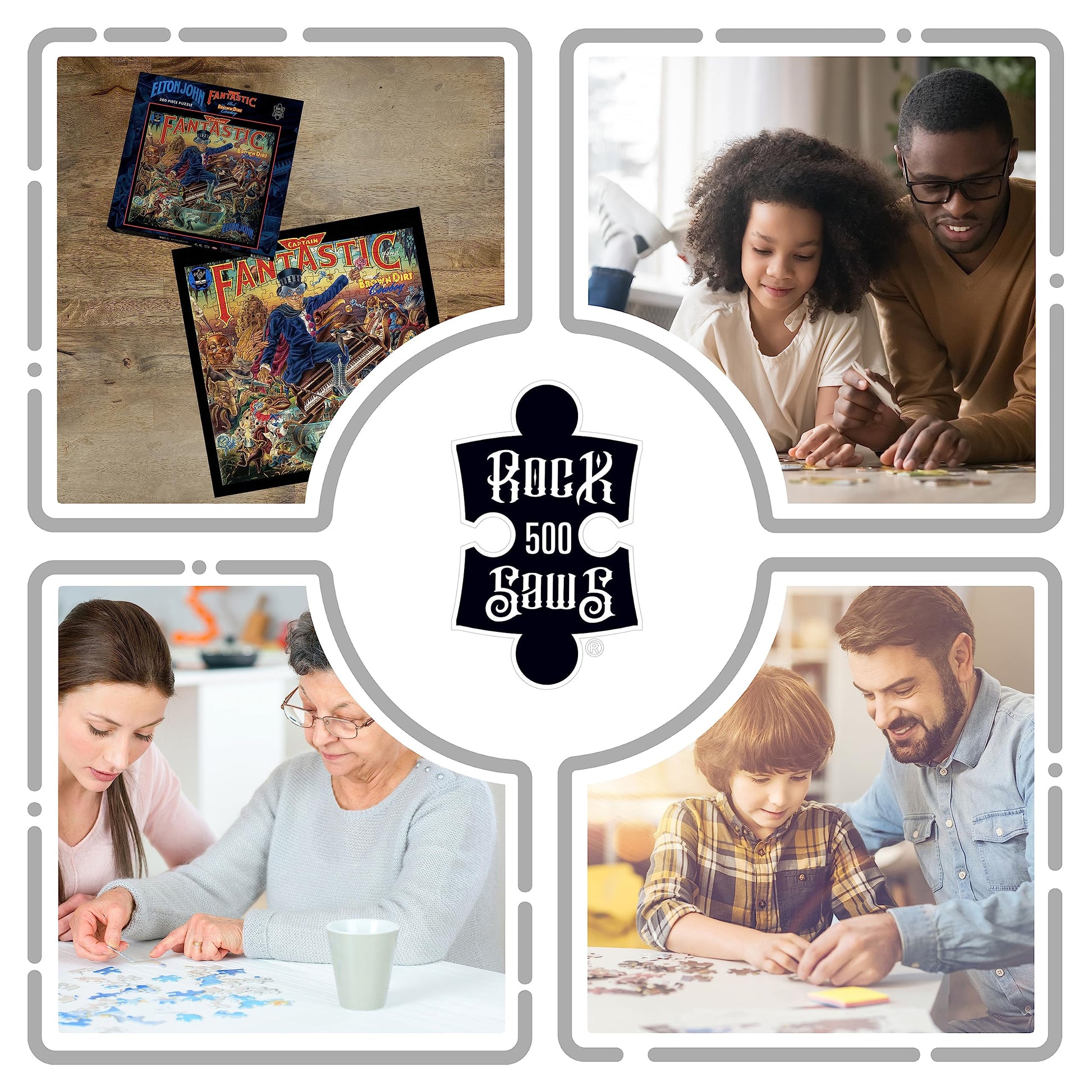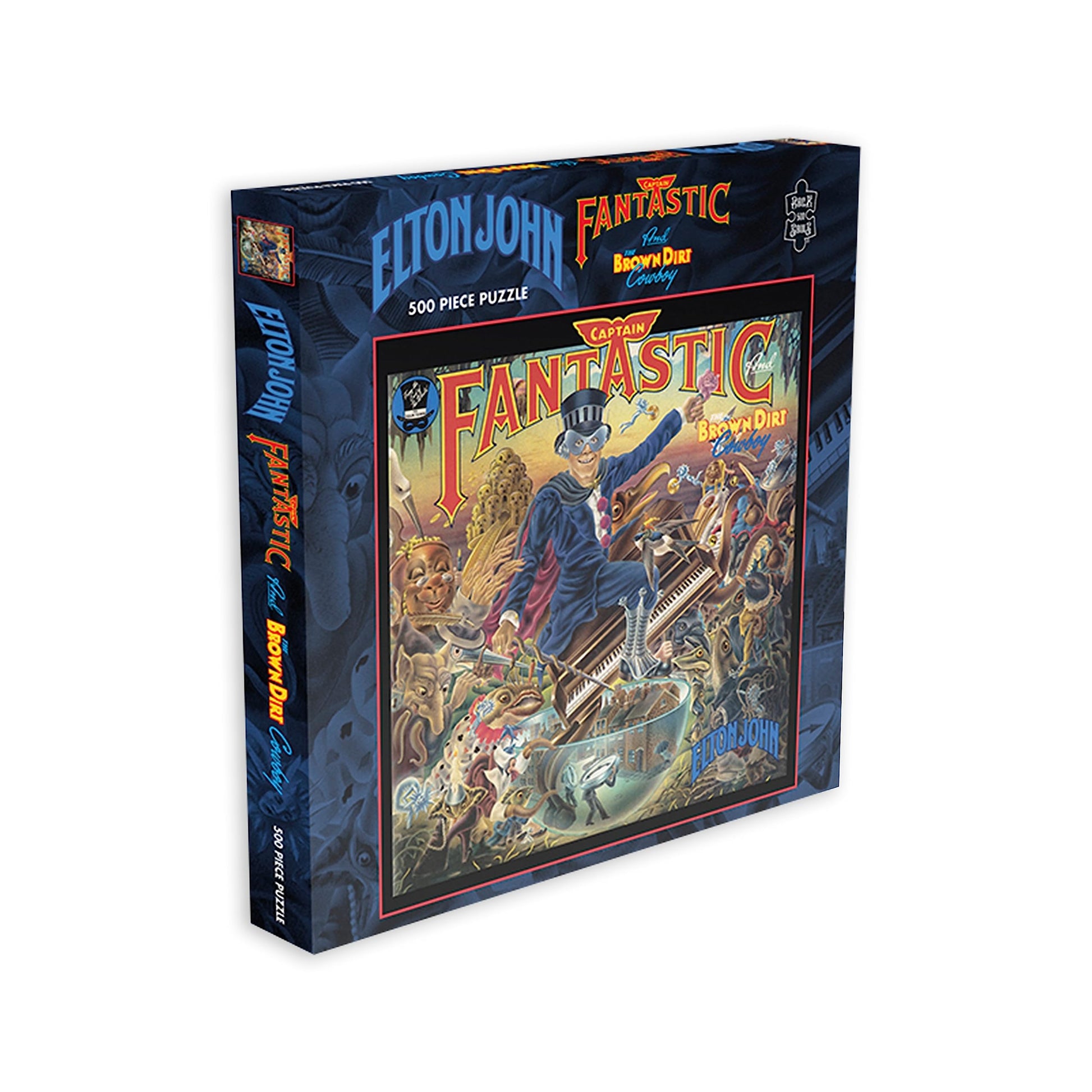 • Q: What is included in the RockSaws Elton John jigsaw puzzle? A: The RockSaws Elton John Captain Fantastic and The Brown Dirt Cowboy jigsaw puzzle includes 500 high-quality pieces that recreate the album's original cover art.