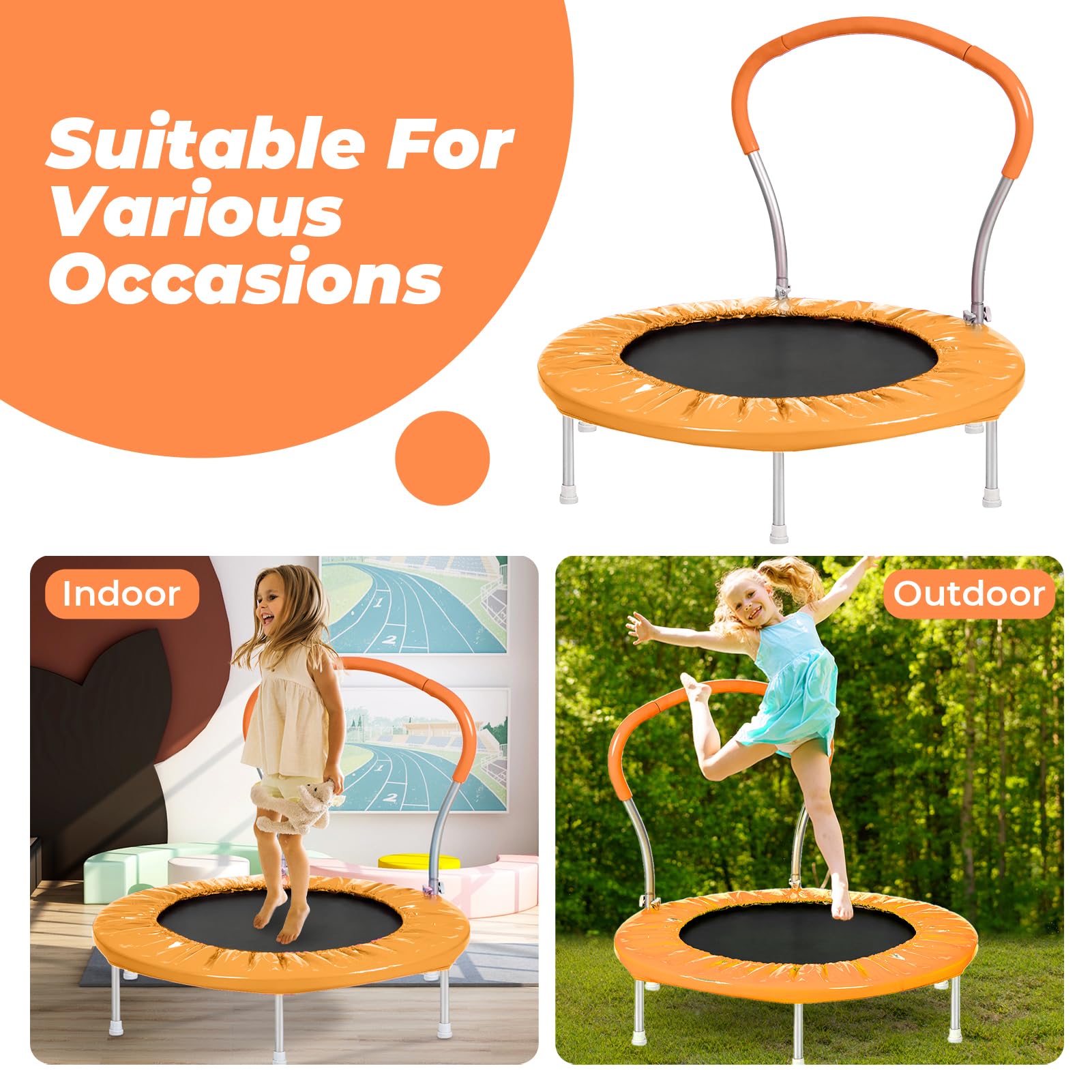 Safe & Sturdy Design for Endless Fun: The Roinoim kids trampoline is built with a durable steel frame and high-quality bungee cords for a safe and quiet bouncing experience. The U-shaped padded handle provides extra support, making it perfect for toddlers and young children to enjoy worry-free jumping fun | 36'' Mini Rebounder for Indoor & Outdoor Play: Compact yet spacious, this 36-inch trampoline is designed for both indoor and outdoor use. Whether placed in a playroom, backyard, or living room, it ensures year-round entertainment and physical activity for energetic kids | Enhanced Stability & Protective Features: Equipped with six non-slip rubber feet, the trampoline stays securely in place, preventing tipping or sliding. The thick foam-padded handle and durable PP jumping mat provide superior grip and shock absorption for a safer experience | Boosts Kids