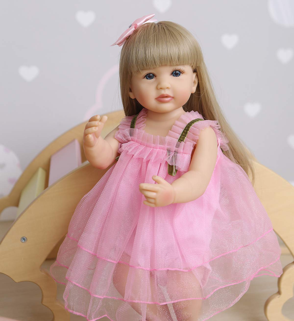 This Huggable Reborn Baby Girl Doll Is A Perfect Doll Art Designed By A Artist. Baby Doll Is So Cute, So Beautiful. You'Re Sure To Fall In Love With Our Lovely Reborn Baby Dolls From The First Sight. But Hold This Reborn Baby On And You'Re Sure To Fall In Deep Love Over Again, Because This Fully Reborn Dolls Is Also Weighted To Feel Real In Your Arms. [Reborn Baby Doll Details:] Material: Silicone Vinyl Full Body And Limbs, Washable And Bathable. Doll Size: Approx. 22 Inches (55Cm), Similar Newborn Baby Size. Net Weight: Approx. 2.8 Lbs. Clothes: This Reborn Doll Wears 0-3 Months Baby Clothes, It Comes With 1 Set Beautiful Outfit Like The Picture Shown. Eyebrow: Hand-Painted, Light Brown Color. Eyes: Opened Blue Eyes, It Can'T Blink. Limbs: Very Poseable, Baby Doll Can Sit And Lie Down But Can'T Stand Up. Hair: Beautiful Wig, Blonde, High Fidelity And Washable, Can Be Combed And Dress Up. [What You Will Get:] 1 X 22 Inches Reborn Baby Doll Silicone Full Body That Look Real Girl 1 X Outfits Set (Lovely&Nbsp;Pink Dress + White Bebe Shoes + Pink Bobby Pin+ Diaper) 1 X Birth Certificate We Are Dedicated To Retain Children'S&Nbsp;Pure Heart, So We Made The Reborn Baby&Nbsp;Dolls.&Nbsp; On The Way Of Children'S Growth, There May Be Many Things That Make Them Feel Confused Or Dejected, But The Reborn Baby Doll Will Always Stay With Them And&Nbsp;Help&Nbsp;Our&Nbsp;Kids&Nbsp;Cultivate Love And Learn To Take Care Of Others.