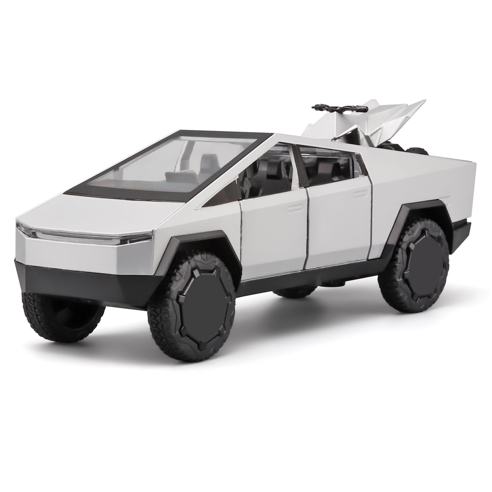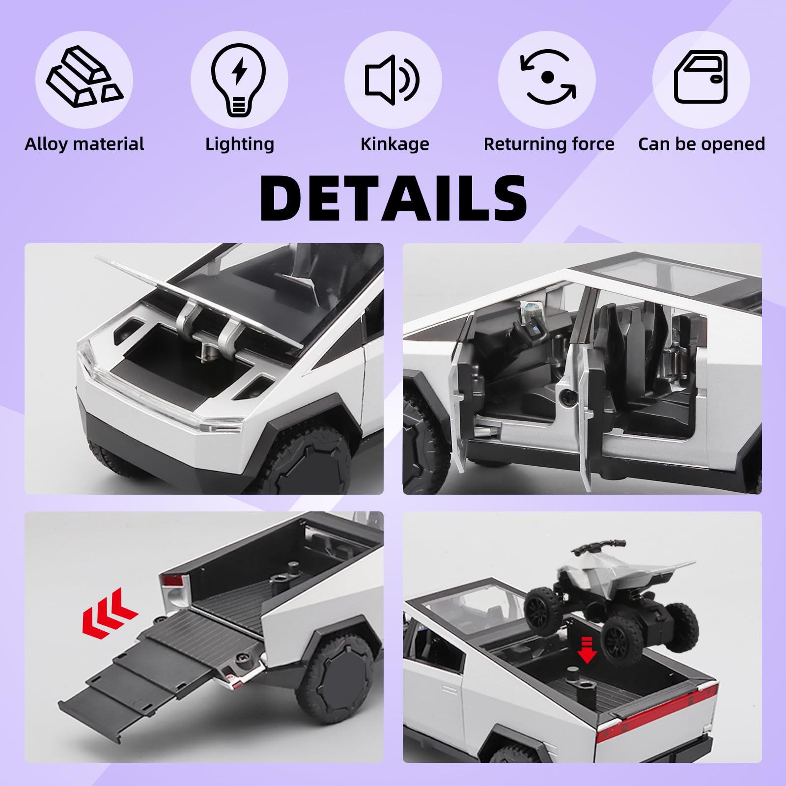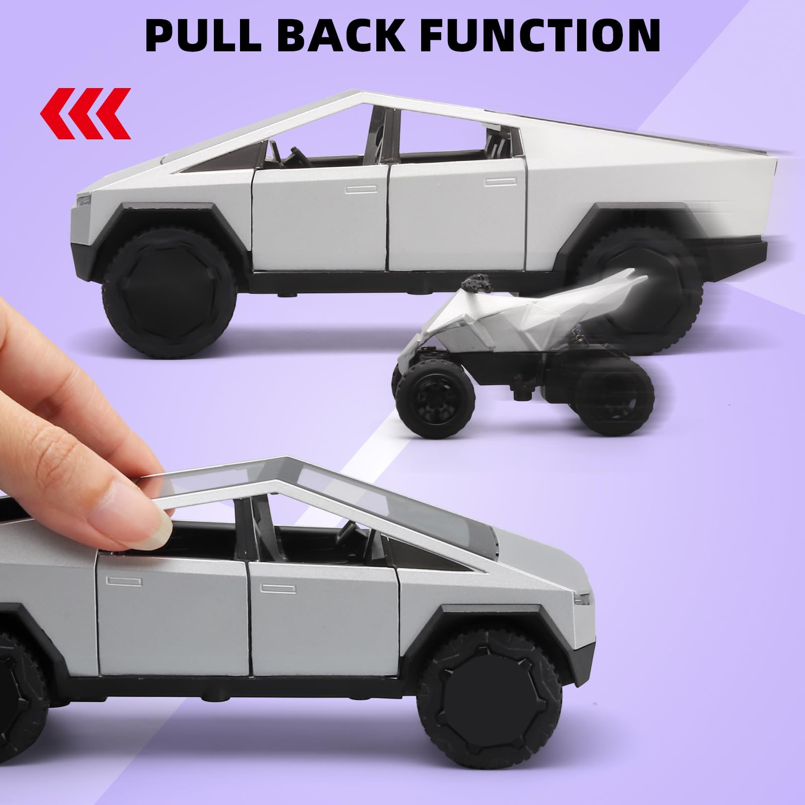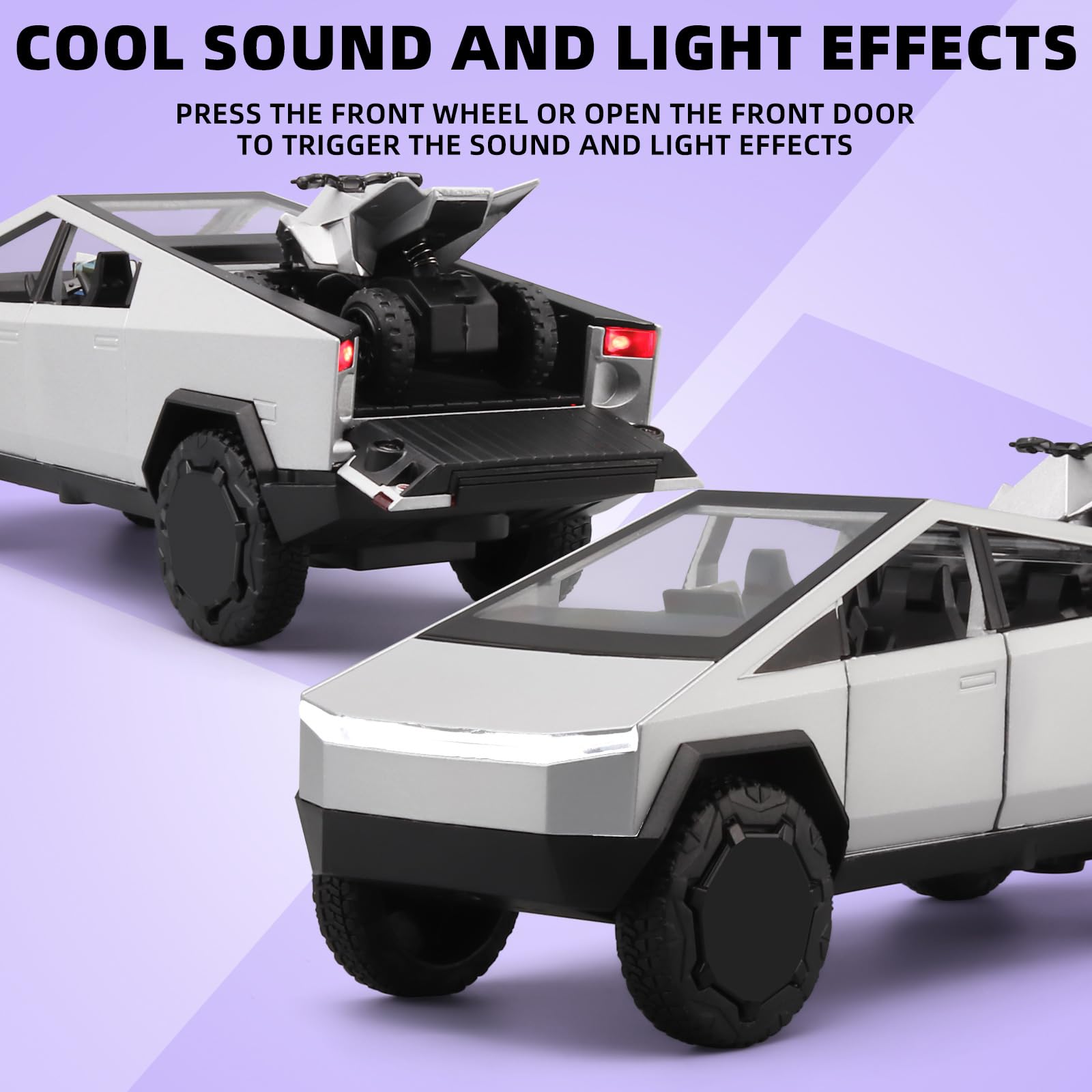 With its cool exterior design and powerful body lines, it is sure to be a hit with kids and model car enthusiasts alike!Our toy pickup truck is made of zinc alloy + ABS plastic. Zinc alloy body, interior and chassis are ABS plastic, rubber tires.Cars for kids ages 4-8.You don't have to worry, our toy truck passes strict quality tests and is CPSIA and CPC certified, so you can rest assured that your child can play to their heart's content.Toy cars for boys age 4-7.The Truck four doors, front hood and rear fender can be opened, the equipped quad motocross bike can be removed, and the rear fender's air suspension can be adjusted.The toy trucks feature cool sound and light effects that can be triggered by pressing on the body or opening the front door, and the headlights and rear taillights come on.Truck toys for toddlers 3-5.If you want to keep your kids entertained for hours while still needing some skills and creativity, this toddler truck toys is perfect for you.Buy it for your children to let them learn about cars while playing and improve their hands-on skills.Trucks for 4 year old boys.Big toy trucks fine workmanship, rich in detail, it is not only like car toys children's toys, but also car model enthusiasts must buy the collection of car models. It can be used to decorate boys' office or boys' room, very suitable for car model enthusiasts to collect.