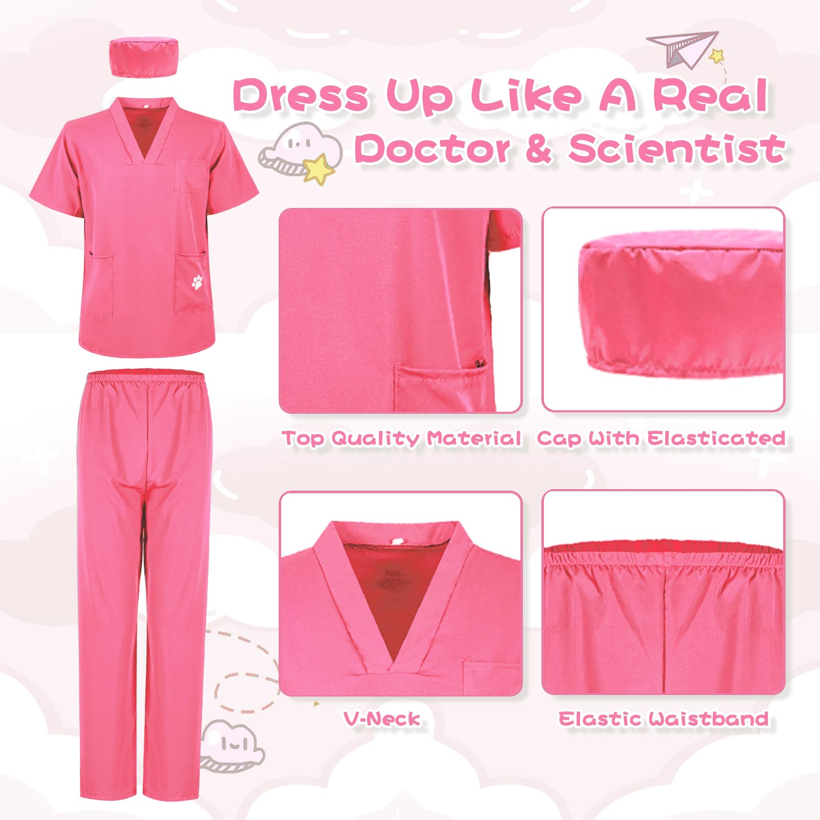?All-inclusive Set? This 5-piece kids' doctor/nurse costume has everything your child needs to play the role, including 1* nurse top, 1* nurse pants, 1* nurse hat, 1* nurse mask, and 1* ID card. | ?High-quality Materials? Our children's doctor costume is made of soft, breathable fabric, ensuring comfort while they play. | ?Unisex Design? Available in three colors - green, blue, and pink - this doctor outfit suits both boys and girls. | ?Fun & Functional? The V-neck, short-sleeved nurse top has three pockets, perfect for storing small items. The left pocket features a cute paw print, adding a touch of playfulness. The pants have an elastic waistband for easy wear. Choose from 7 sizes to fit kids aged 3-16 years. | ?Educational & Entertaining? This doctor costume isn't just about dress-up. It's a chance for kids to develop creativity, social skills, and learn about responsibility and kindness through role-playing as doctors, nurses, or vets. Perfect for Halloween, career days, or anytime your child wants to be a hero for hours of imaginative play.