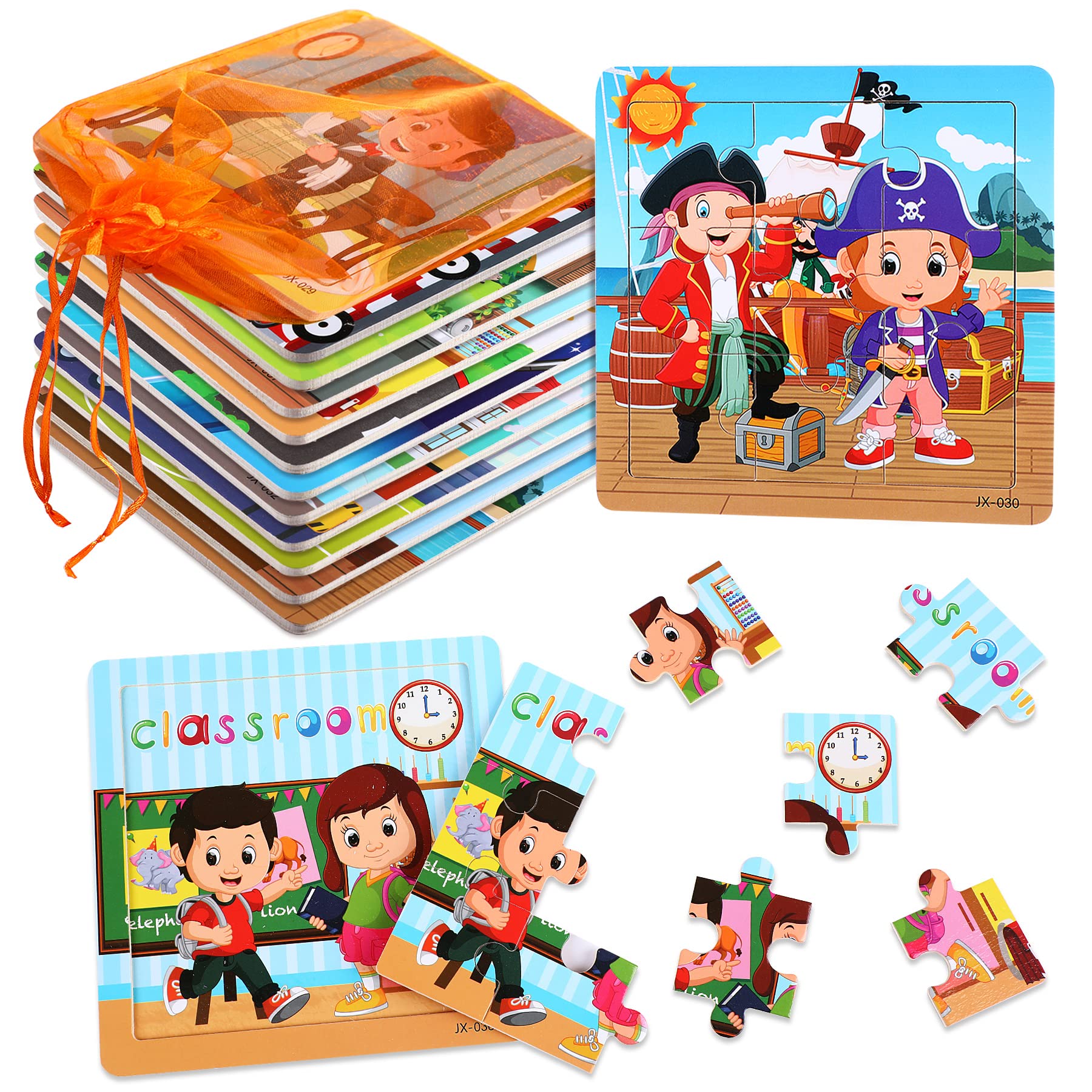 Sannix 12 Pack Wooden Jigsaw Puzzles For Toddlers, Characters Puzzles For Kids Party Favors, Educational Puzzles Learning Travel Toy With 12 Organize Bags