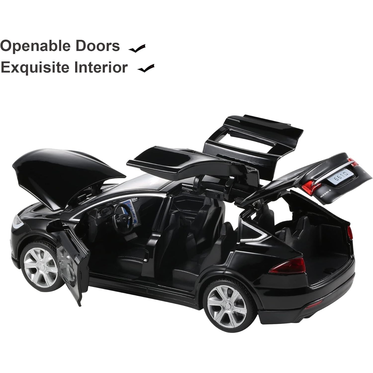 Material:Alloy+ABS,rubber tire and solid structure | Material:Alloy+ABS,rubber tire and solid structure | Open the door,turn on the headlights and tail lights | Pull Back Cars with Sound and LED Model X 90 Toys cars for 3 to 12 year | Size:5.91 inch x 2.16 inch x 1.77 inch.(1:32 Scale)