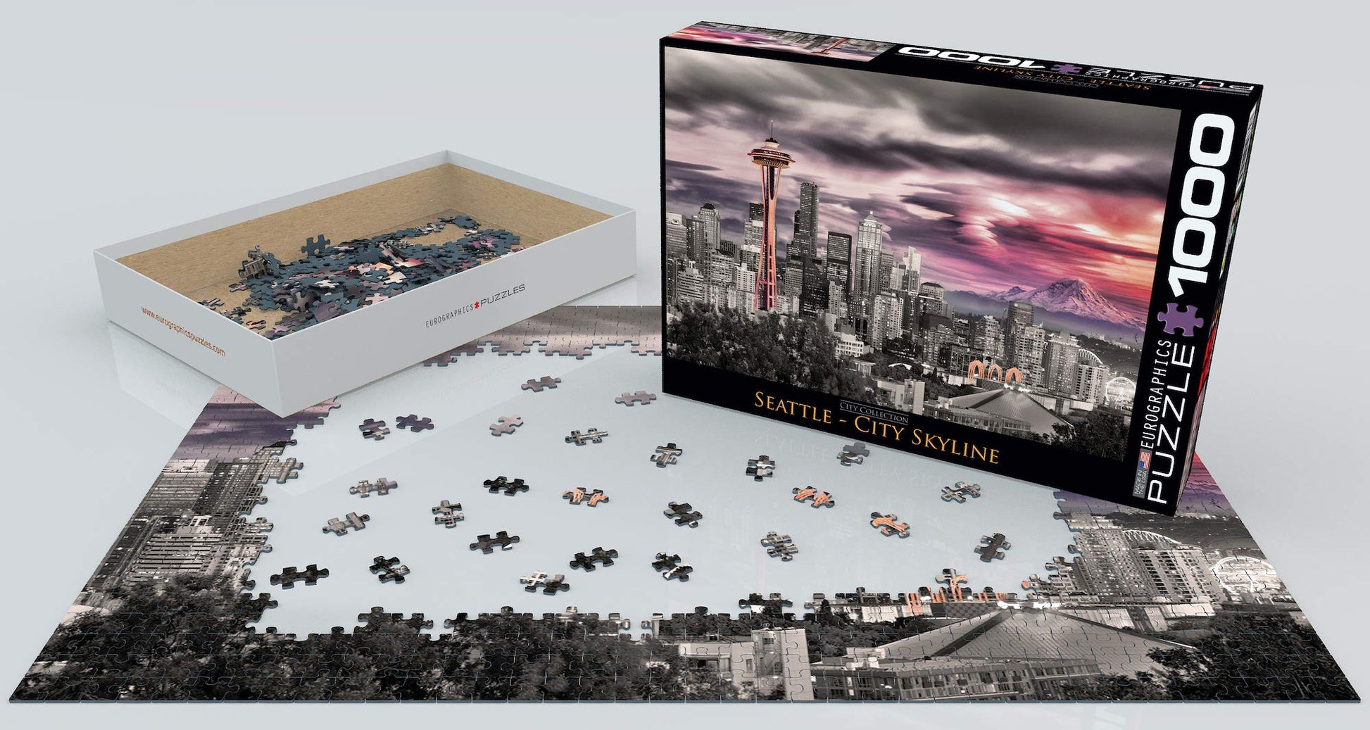EuroGraphics Seattle City Skyline 1000-Piece Puzzle. Box size: 10' x 14' x 2.37'. Finished Puzzle Size: 19.25' x 26.5'. Famous for the Space Needle, the largest tower in Seattle is actually Columbia Center, with the highest observation deck in the state being located on the building's 73rd floor. Strong high-quality puzzle pieces. Made from recycled board and printed with vegetable based ink. This superior quality puzzle will delight and educate all at the same time.