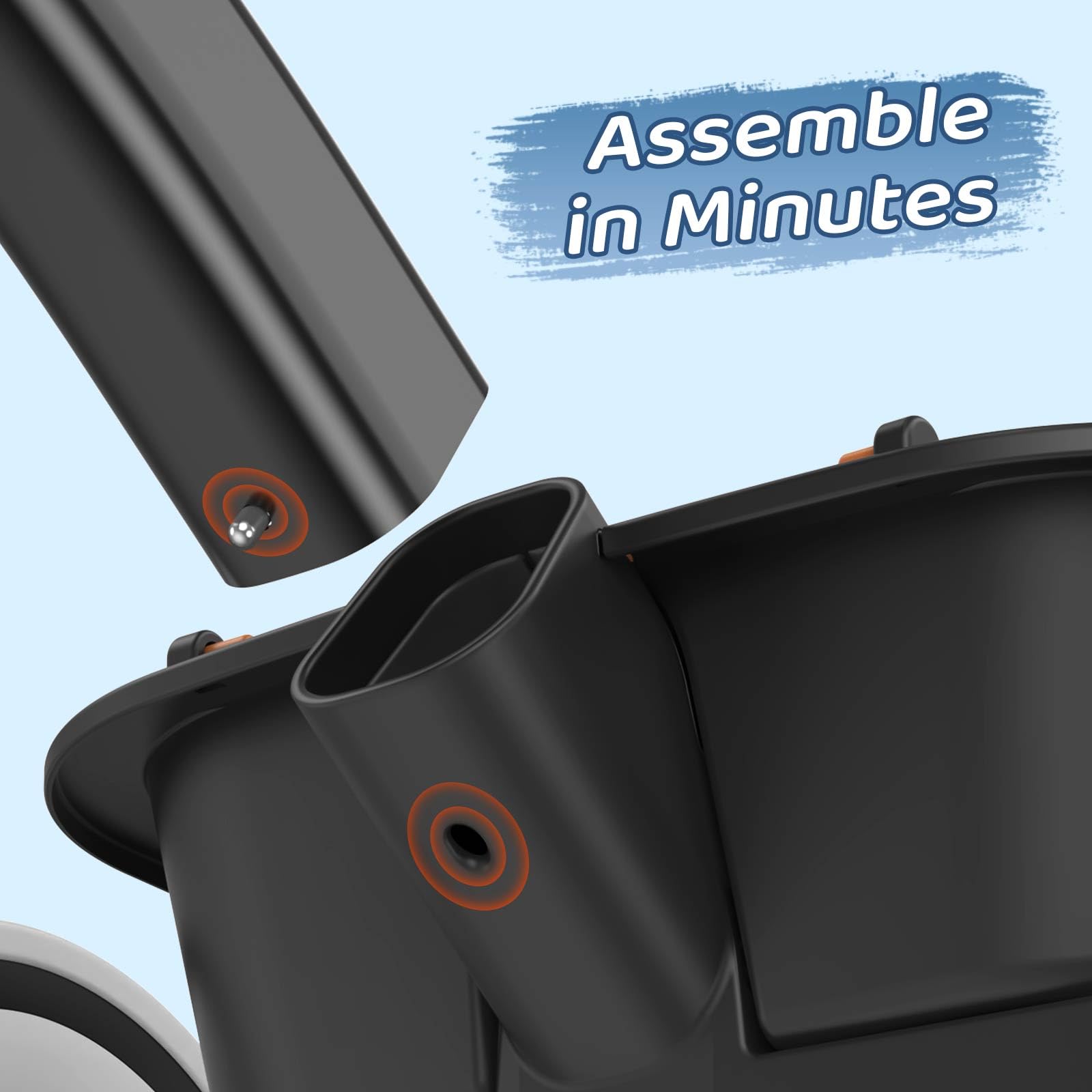 - Q: How easy is it to assemble the tricycle? A: The tricycle features a quick assembly design with a spring-loaded snap mechanism, allowing you to have it fully assembled in just a few minutes, so your child can start riding right away.