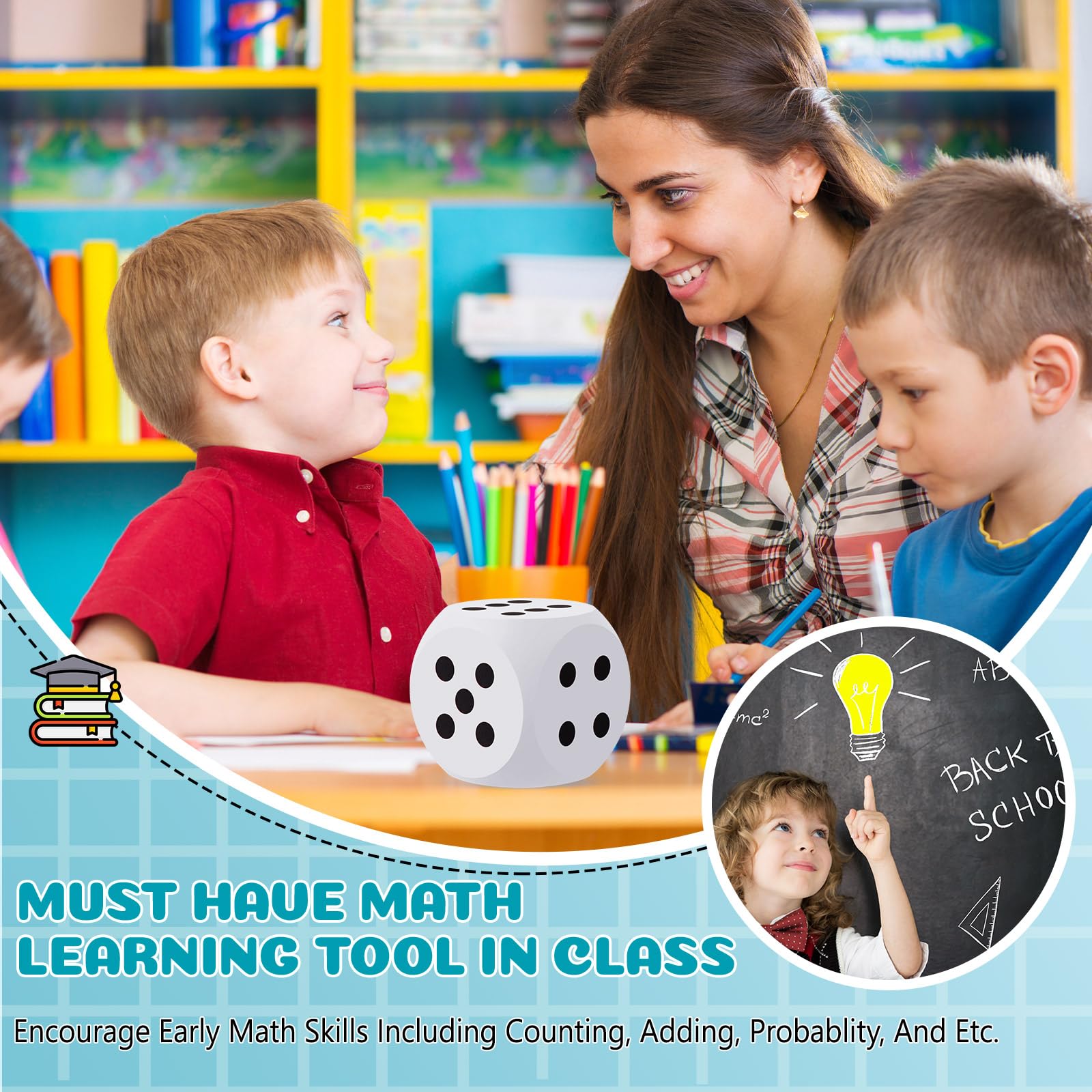 Features: Designed to aid learning through a fun approach, these game dices help promote your math skills by introducing them to probability, arithmetic, and critical thinking. It's a nice and amusing way to make learning enjoyable. You can play worry about nothing with our foam dices. Because of their lightweight, soft characteristics, there's no chance of window breakages or injuries. And you can roll those dice without any trepidations. Specifications: Material: EVA foam Main color: white Size: about 3 x 3 x 3 inches Package includes: 1 x Foam dices Notes: Manual measurement, please allow slight errors on size. The color may exist a slight difference due to different screen displays. Suitable for people over 6 years old, and it's recommended to use under the supervision of adults in case of choking risk.