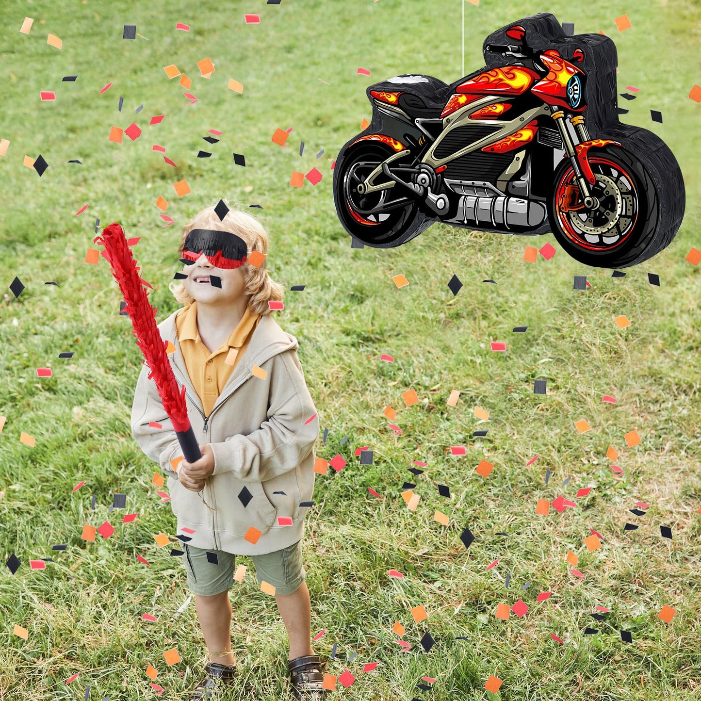 - Complete Party Set: The package includes a stunning red motorcycle pinata, a sturdy pinata stick, a fun eye mask, and a bag of colorful square confetti (50g). Everything you need for an exciting racing-themed birthday party is right here!