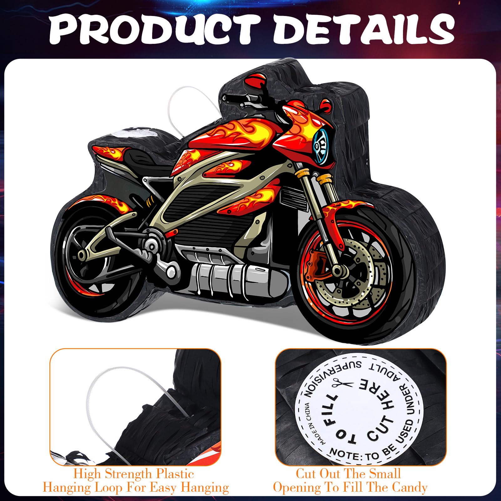 - Multi-Purpose Decoration: Not just a game, our motorcycle pinata can also be used as a striking centerpiece or decoration. Hang it from ceilings, windows, or trees to enhance your party's festive atmosphere.