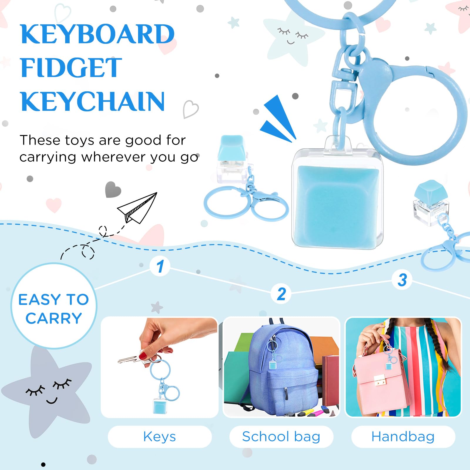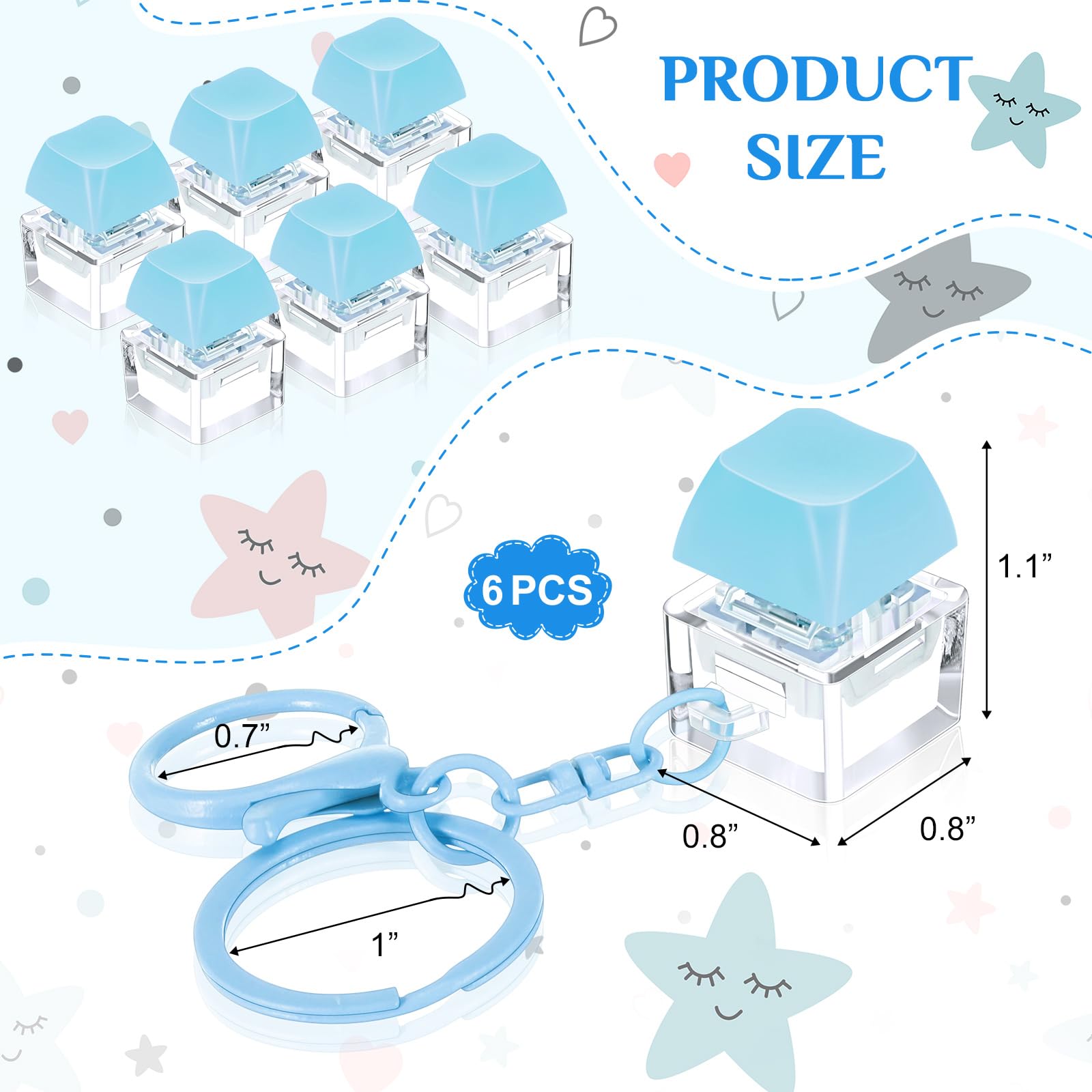 Features: The fidget toy measures 1.1 x 0.8 x 0.8 crafted from plastic material in a pink color. Each pack comes with 6 keyboard fidget toys meet your daily needs. Crafted from quality ABS material the key caps of the fidget keyboard toys boast a smooth surface to prevent finger fatigue even after prolonged usage meet your usage needs. Specifications: Material: plasticColor: blueSize: 1.1 x 0.8 x 0.8 inches/ 2.8 x 2 x 2 cmPackage includes: 6 X Keyboard fidget toyNotes: Manual measurement please allow slight errors on size. The color may exist a slight difference due to different screen displays. It's recommended to use under the supervision of mature-themeds in case of choking risk.