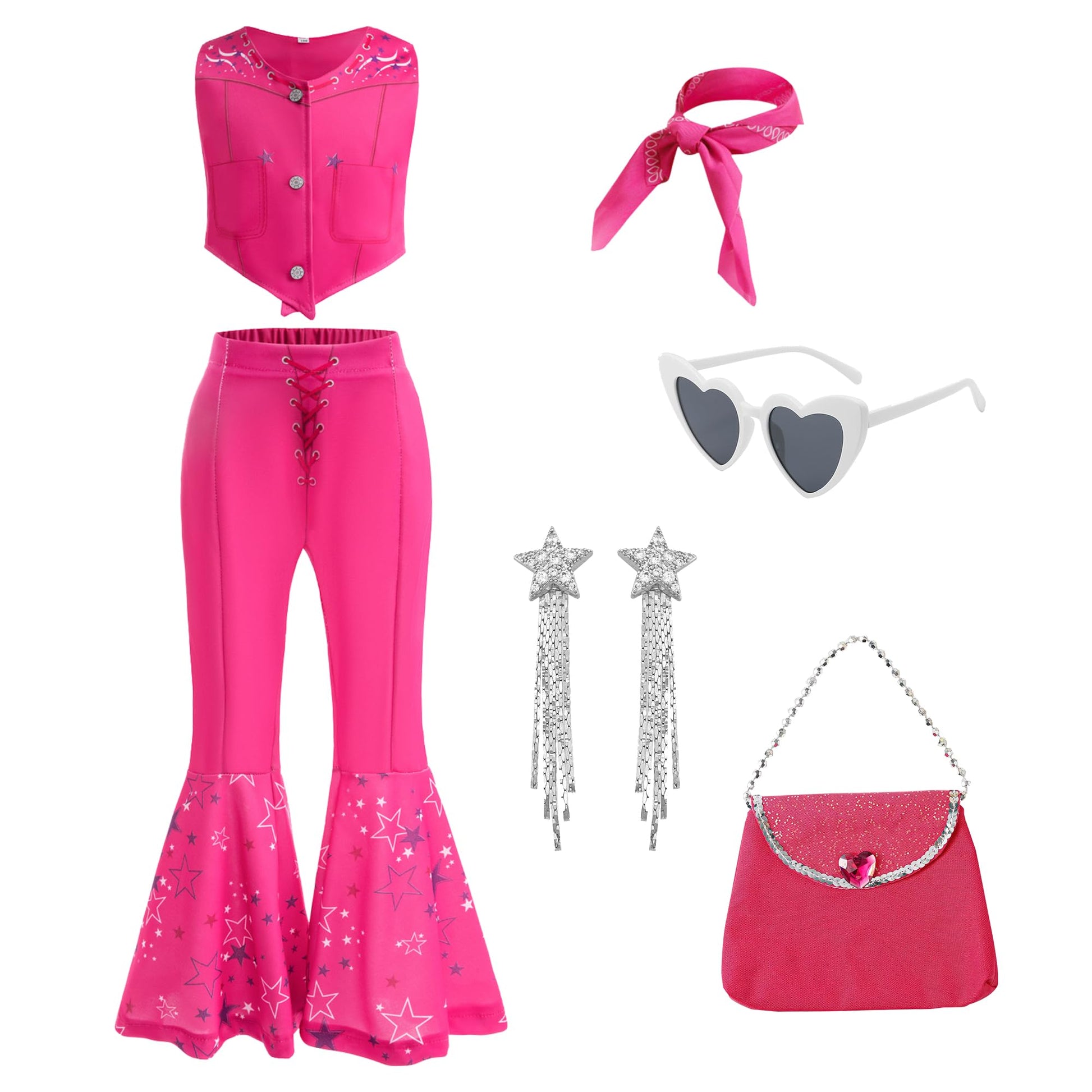 Design concept: Our cowgirl costume for girls features a charming rose vest, pants and scarf and Star earrings, encouraging your child's imagination. It sparks storytelling and imaginative play, empowering her to become the hero of her own wild west tales.Fashioned after the popular 2023 doll movie ,with this cowgirl costume, your girl will look like she stepped right out of the movie. | Premium Quality: Crafted from high-quality materials, our 80s cowgirl cowgirl costume offers durability and comfort. | Suitable occasions: Perfect for dress-up fun, Halloween and Birthday party, themed parties, or everyday adventures, our cowgirl outfit lets your child explore her creativity while embodying the spirit of adventure. | Accessories Included: 1*Scarf, 1*Heart-shaped glasses,1* Star earrings,1*Bag. Your movie fans girls is worth having them. | Size Choice and Warm Tips : This movie rose costume fits girls aged from 4 to 12. Please wash it by hand and do not use a washing machine. We recommend washing the accessories and the dress separately. Please note that age is only an approximate guide for size. Please measure your girl