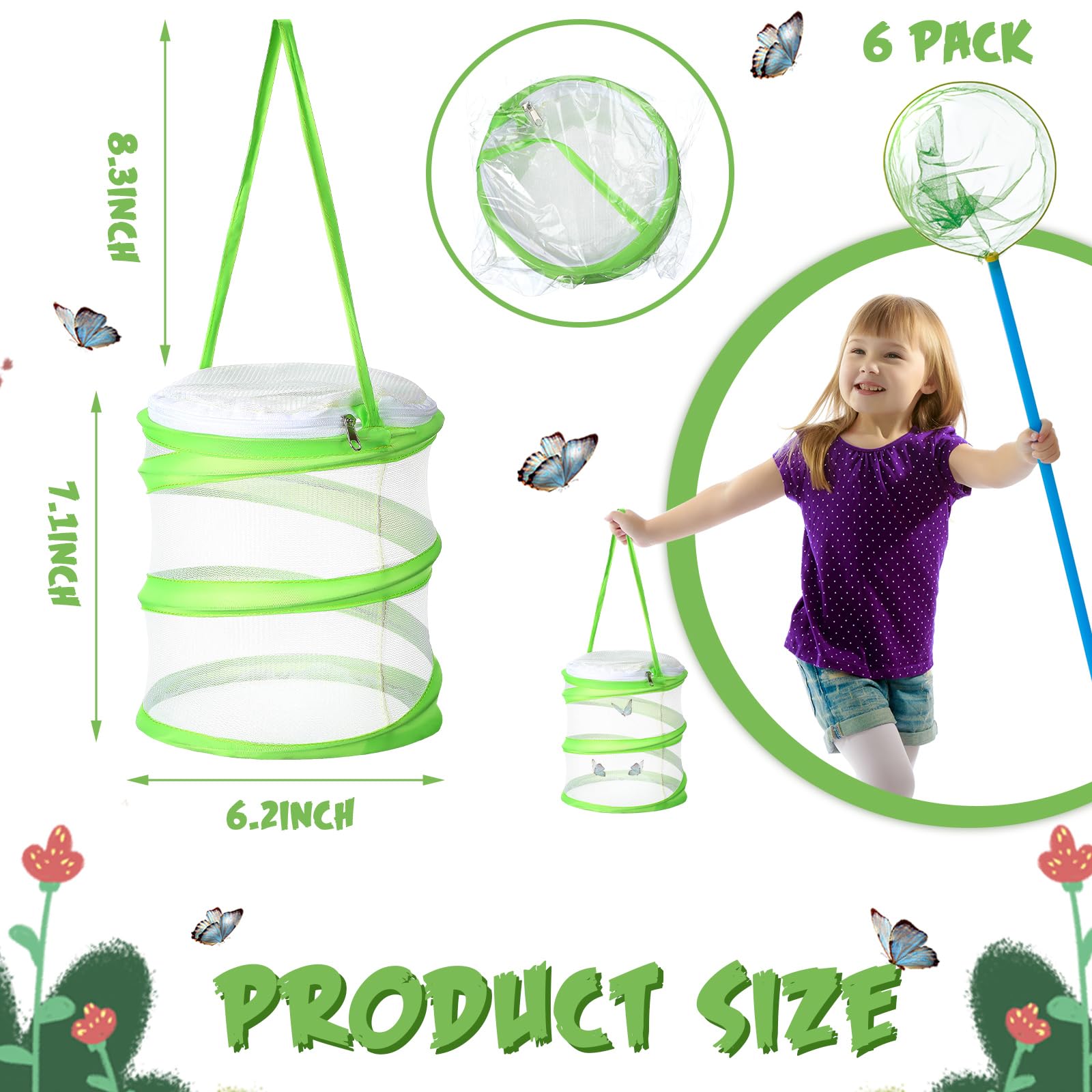 Features: Large zipper top opening is easy to deposit and remove butterflies, plants, branches, water, and food, suitable for butterflies to live. You will receive a total of 2 pieces of mini butterfly net habitats, sufficient quantity that can satisfy your daily use and replacements, and you can share them with others to use. Specifications: Material: metal, polyester mesh Color: green Size: Unfolded size: 6.3x7.1inch Package includes: 6 x Butterfly net cages Notes: Manual measurement, please allow slight errors on size. The color may exist a slight difference due to different screen displays
