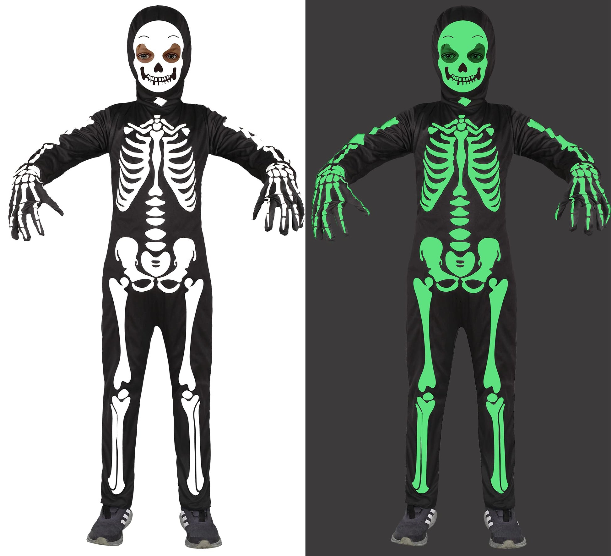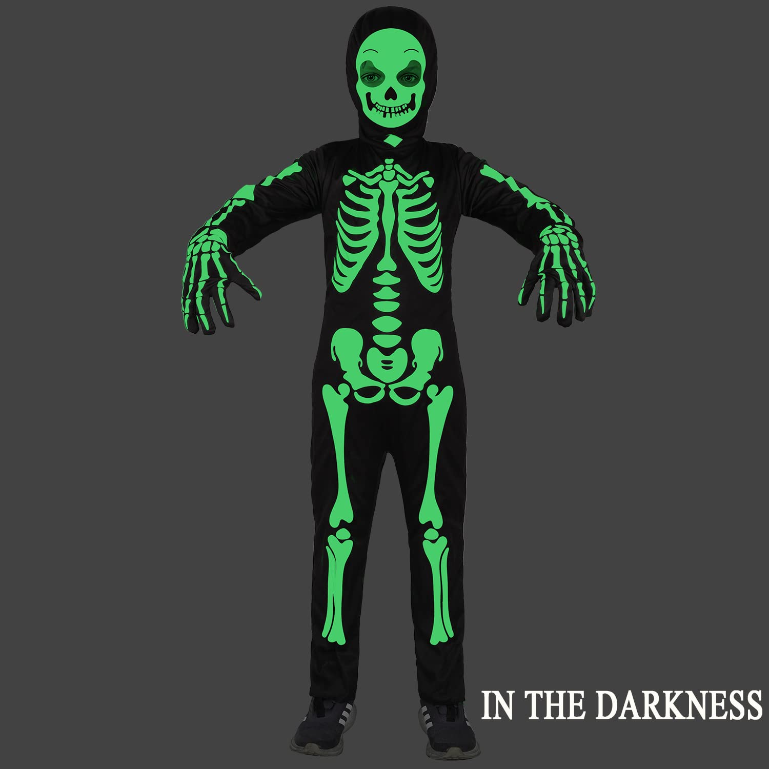 Kids skeleton costume included Jumpsuit Skull Hood Skeleton Gloves Glow will work better If shining it under bright light 15-20min. Darker place you put, much more lights you will see. Do not wash.