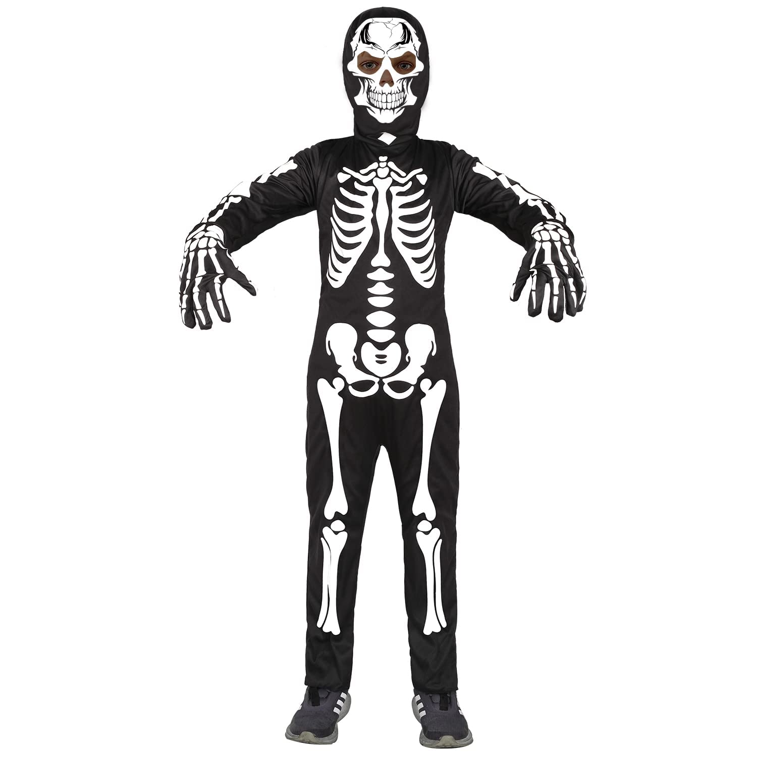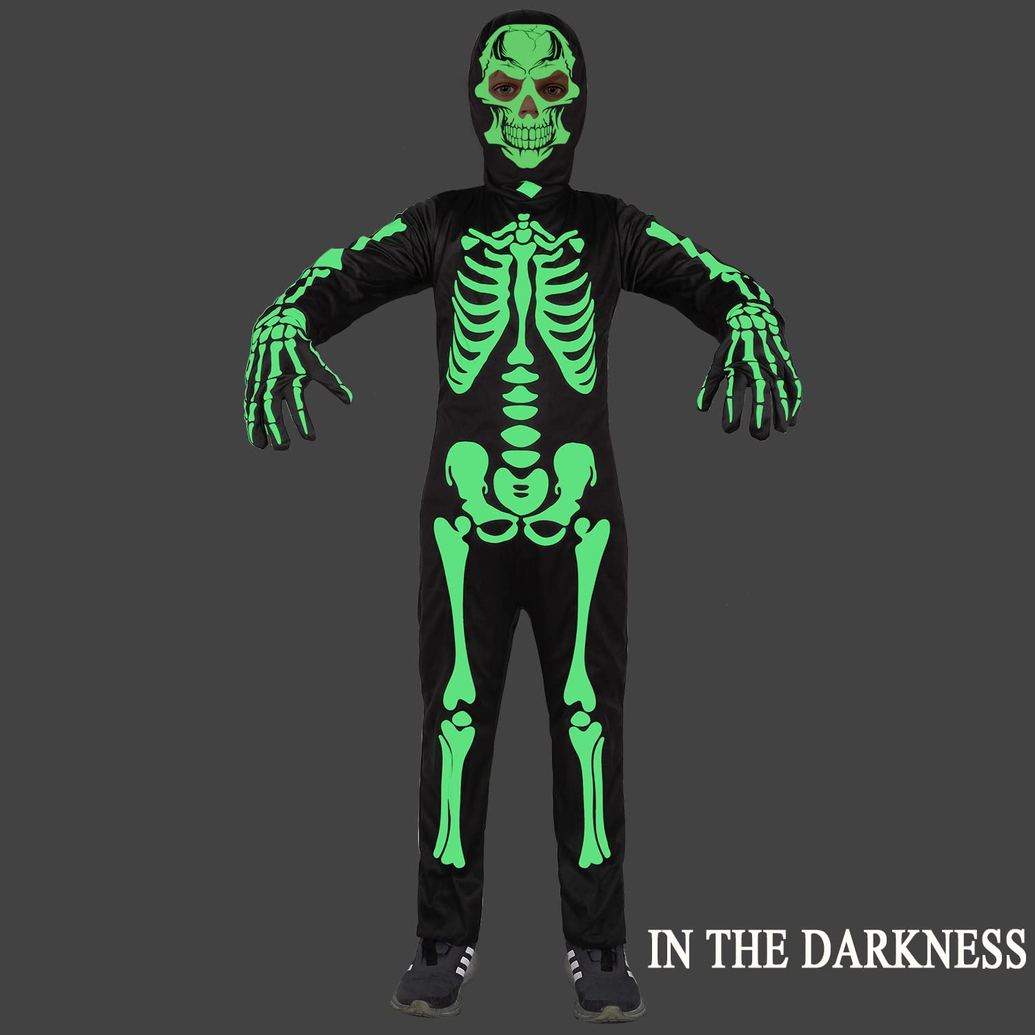 Kids skeleton costume included Jumpsuit Skull Hood Skeleton Gloves Glow will work better If shining it under bright light 15-20min. Darker place you put, much more lights you will see. Do not wash.