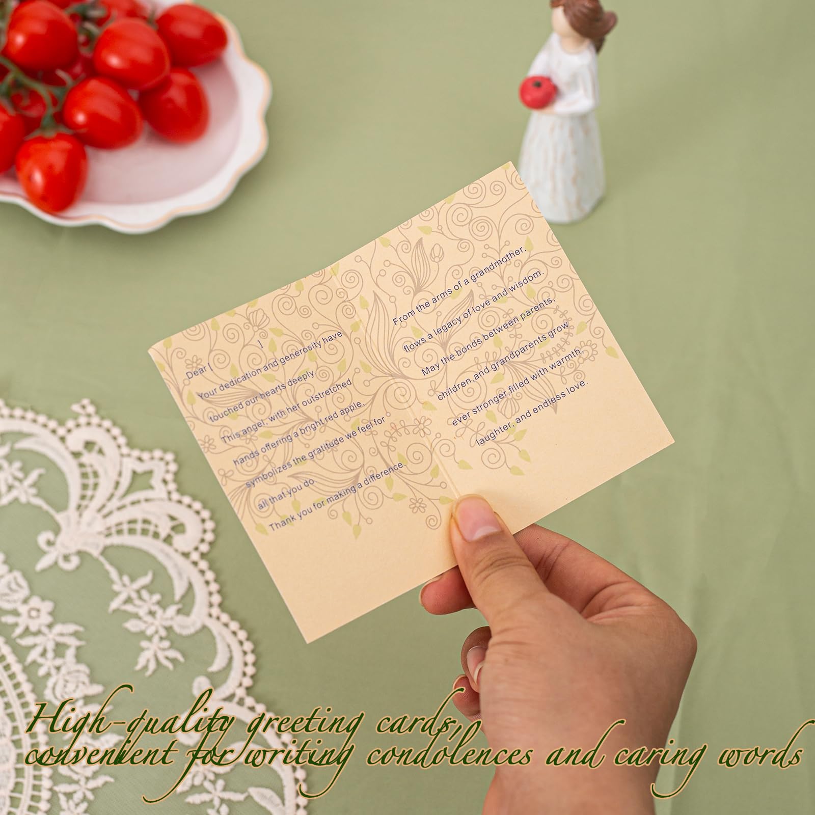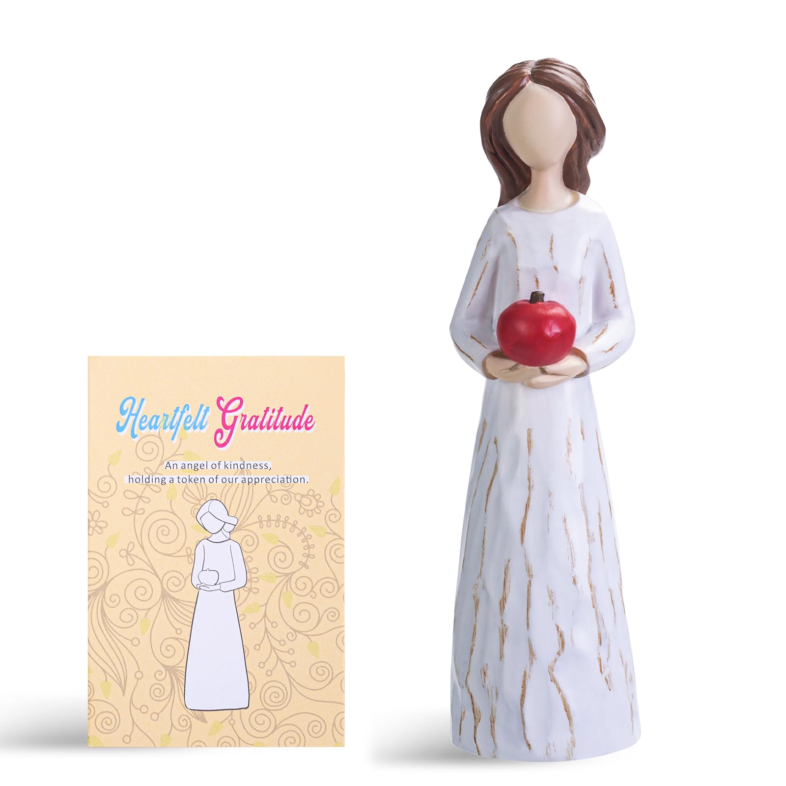 Symbol of Gratitude: This hand-painted resin sculpture of a woman holding a red apple beautifully captures the essence of appreciation, making it a perfect token of thanks for teachers, volunteers, donors, caregivers, and friends. Perfect Gift of Thanks: Ideal for expressing heartfelt gratitude, this sculpture serves as a meaningful gift to show appreciation for the dedication and kindness of those who make a difference in our lives. Elegant Gift Presentation: Comes in a beautifully designed gift box with a heartfelt greeting card that reads: ''Heartfelt Gratitude - An angel of kindness, holding a token of our appreciation,'' making it ready for presenting on any occasion. Heartfelt Message: The cards interior conveys warm and sincere thanks, acknowledging the recipient's contributions and celebrating the impact they have on others. High-Quality Craftsmanship: Expertly crafted from durable resin and meticulously hand-painted, this sculpture is designed to be a lasting tribute to the kindness and generosity shown by teachers, caregivers, and other appreciated individuals.