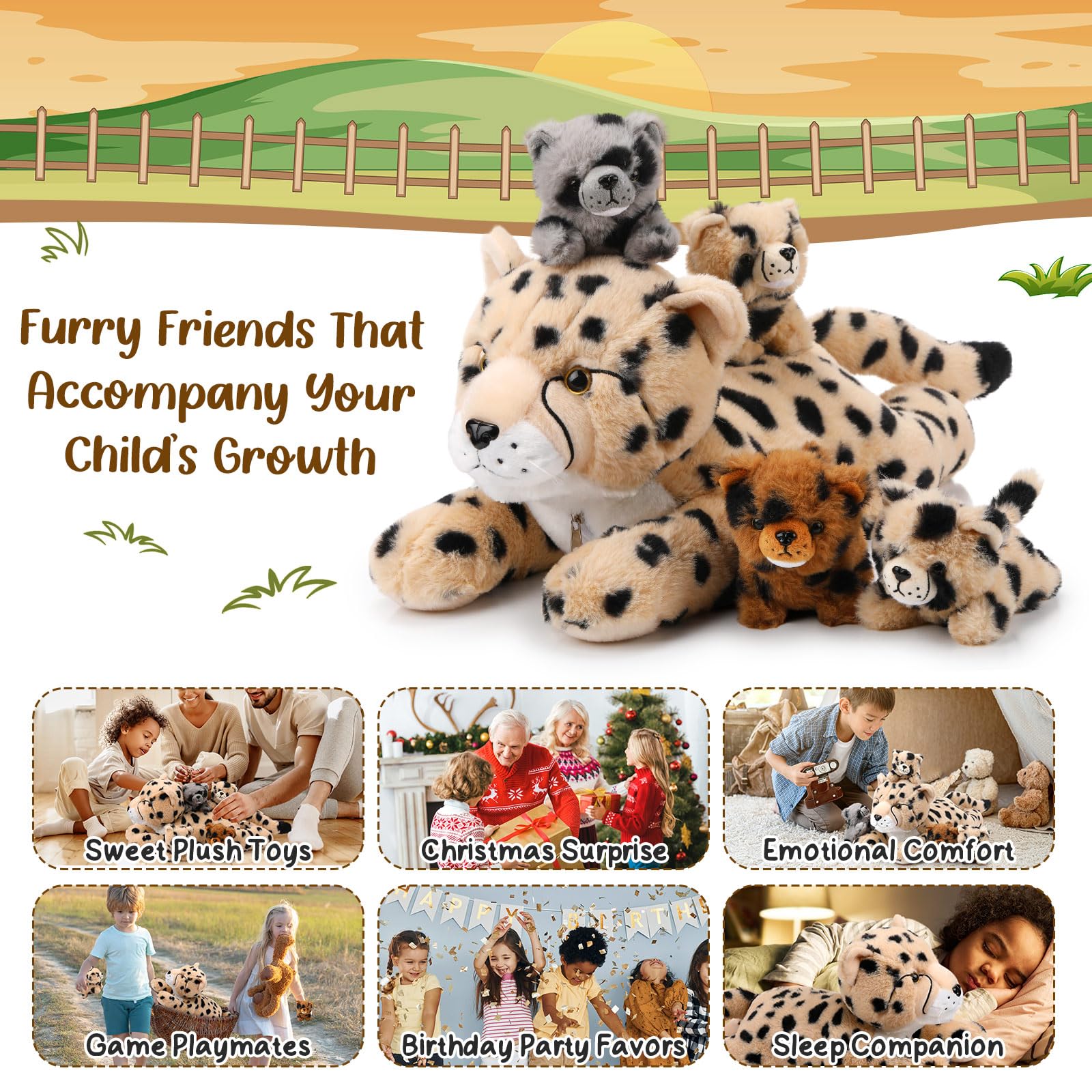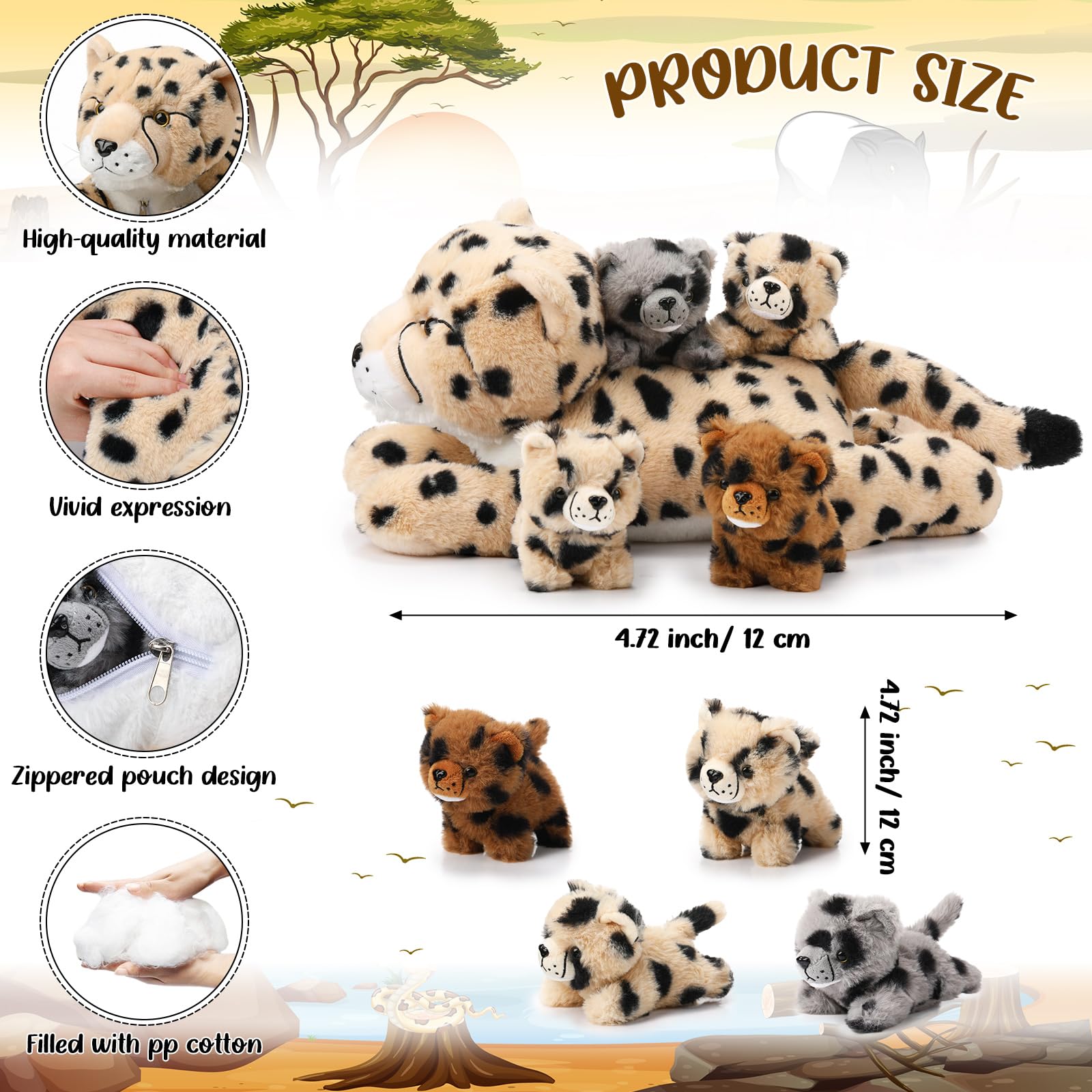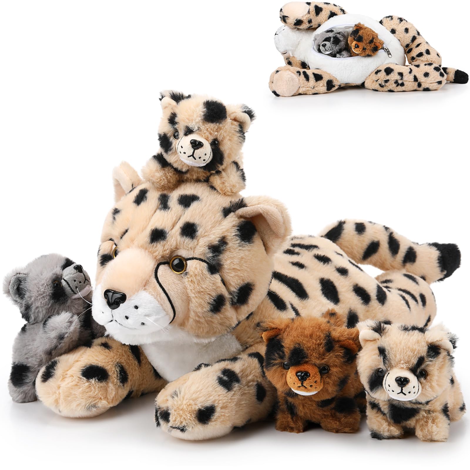 - Q: Can the mother cheetah hold the baby cubs inside her? A: Yes, the mother cheetah features a back zipper that allows the baby cubs to be stored inside, making it a fun and interactive feature for kids while also promoting nurturing play.