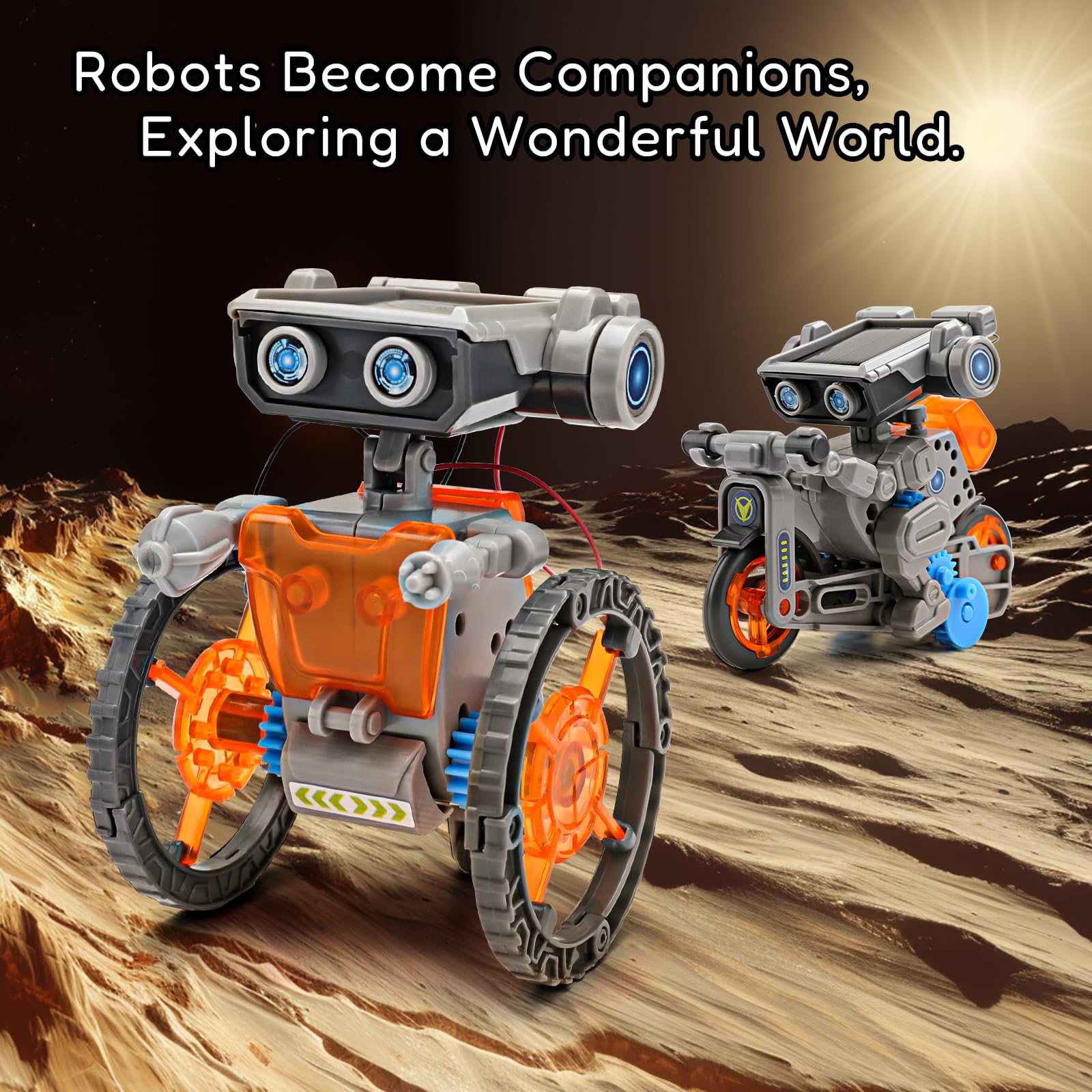 • Q: How does the dual power feature work on this robot kit? A: The Solios-Nova features a dual power system that allows it to operate using solar energy or battery power. This ensures that children can play and learn indoors or outdoors without interruptions, regardless of weather conditions.