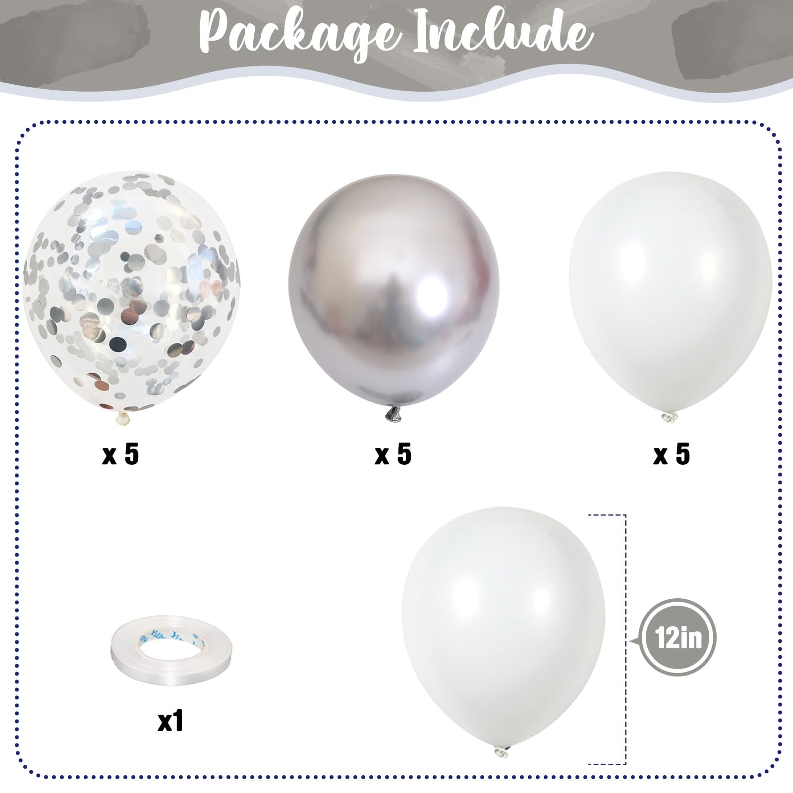 - Q: How many balloons are included in the set? A: The set includes a total of 35 balloons: 15 white balloons, 10 metallic silver balloons, and 10 silver confetti balloons.
