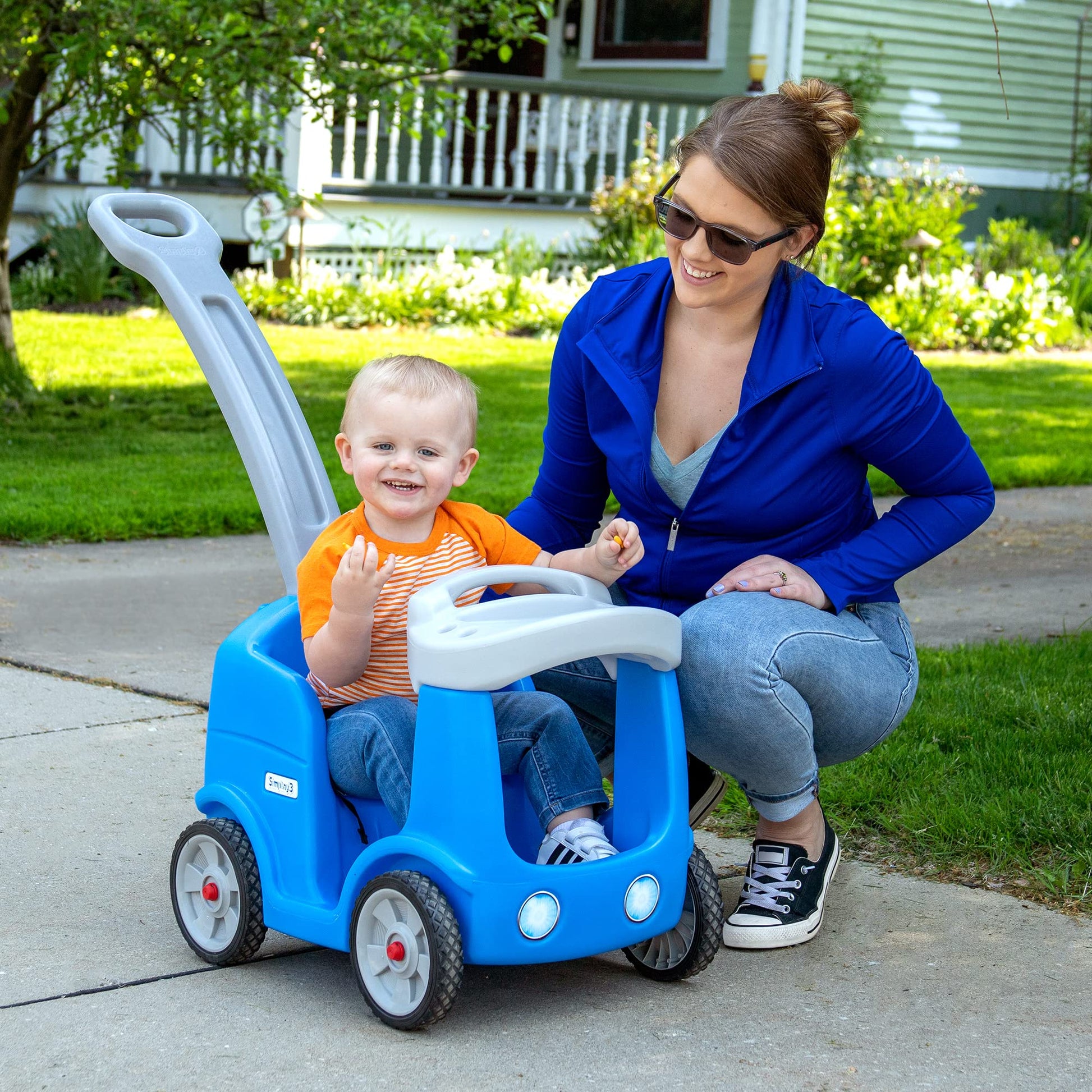 Simplay3's Roll and Stroll Quiet Ride Push Car is a fun alternative to a toddler stroller. The easy grip handle is just the right size to make strolling comfortable for parents and caregivers, and kids get a great and safe ride with the comfortable high back seat, seat belt, activity tray and abundent leg room. This parent powered push car ride-on for toddlers has storage room for snacks, and provides hours of comfortable riding for children. Kids are happy to stay in their seats using the activity/snack tray, and have a grip bar to hold on to if the ride gets a bit bumpy. The quiet wheels mean adults can relax, too, without the racket that traditional plastic wheels can make. Plus, the soft-ride wheels make it more comfortable for kiddos and provide easier communication between caregiver and child.