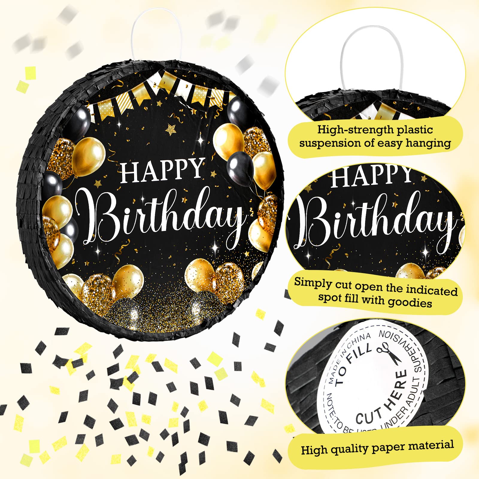 Sinmoe Birthday Piata with Stick Blindfold and Confetti for Boys Girls Men Women Birthday Party Supplies(Black and Gold)
