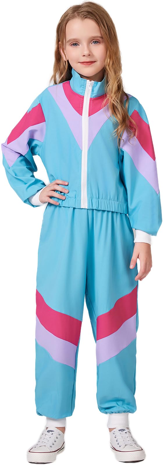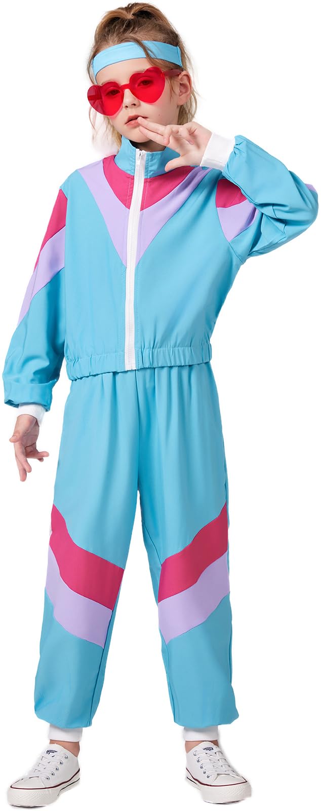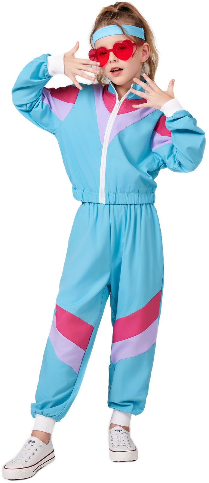 This girls' 80s/90s retro windbreaker set includes a vibrant jacket, pants and matching headband(Sunglasses not included), designed to capture the energetic style of the iconic fashion era. Made from lightweight, breathable fabric, it ensures comfort for all-day wear. Available in sizes for girls aged 5-6(S), 7-8(M), 9-10(L), and 11-12(XL) years, this girls retro tracksuit is perfect for themed parties, Halloween, hip hop, dance, outdoor, retro events, or just adding a fun, nostalgic touch to everyday wear.