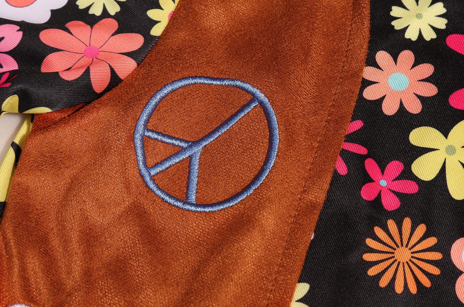 Transform your little girl into a free-spirited hippie with this vibrant and complete costume set. The outfit includes a colorful hippie dress with fringe vest, flower headband, fringe leg sleeves, peace sign earrings, peace sign necklace, retro pink sunglasses, and hippie tattoo stickers. Crafted from soft, breathable fabric, this comfortable and durable costume is perfect for long hours of imaginative play. Ideal for a variety of occasions, including Halloween, themed parties, school events, birthday parties, and more, this authentic hippie design encourages creativity and fun. Let your child embrace the 70s vibe with this standout hippie costume.