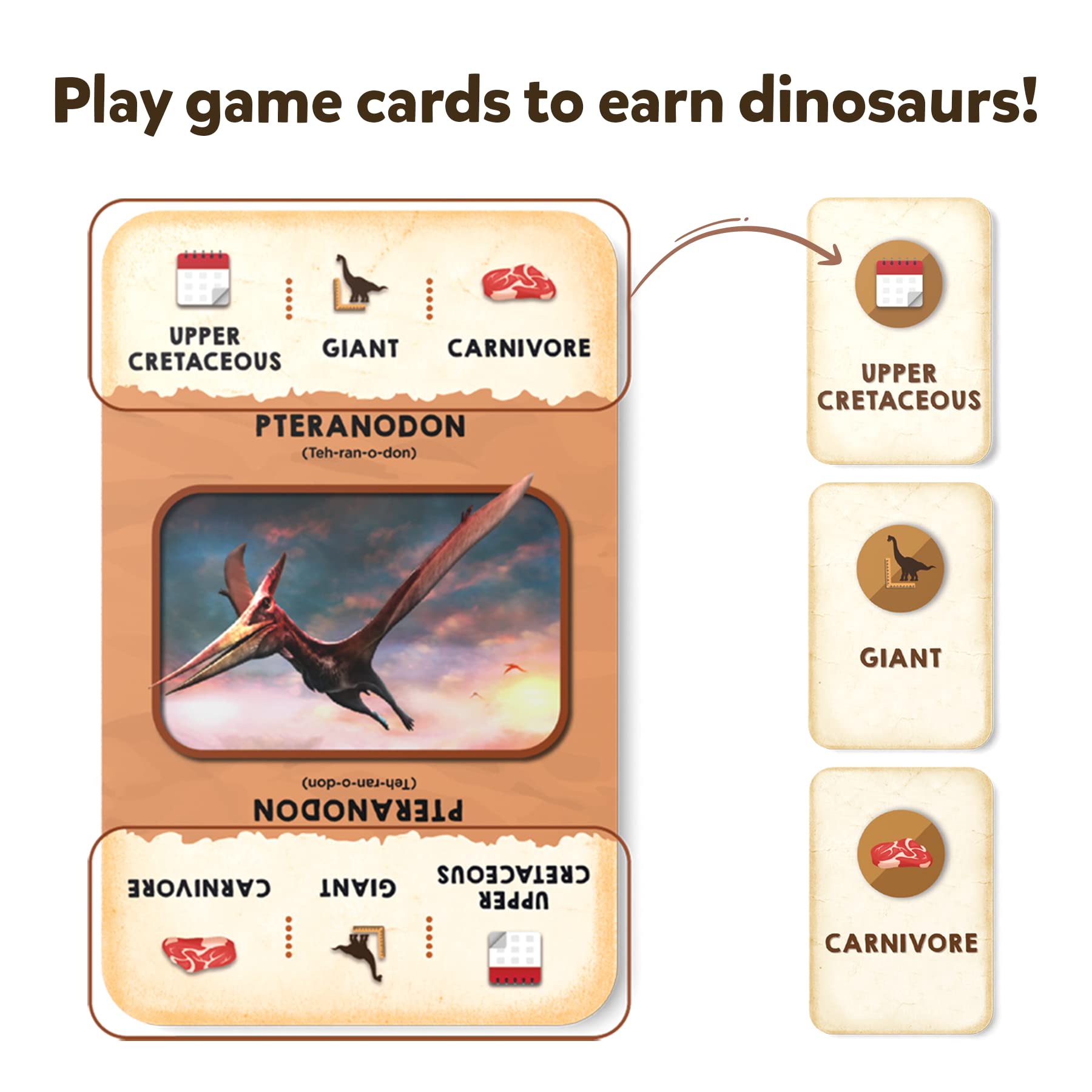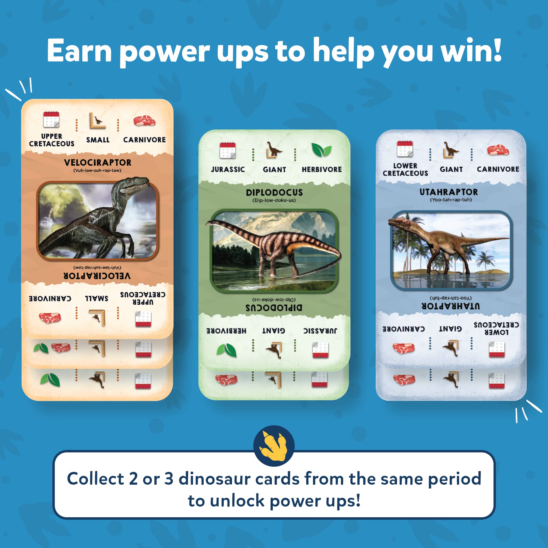 Get ready to dive deep into the past to meet some deadly dinosaurs! Strategize and swap your cards smartly to collect the Game Cards that describe the Dinosaur you need! Be the first player to win a Dinosaur Card from each period!