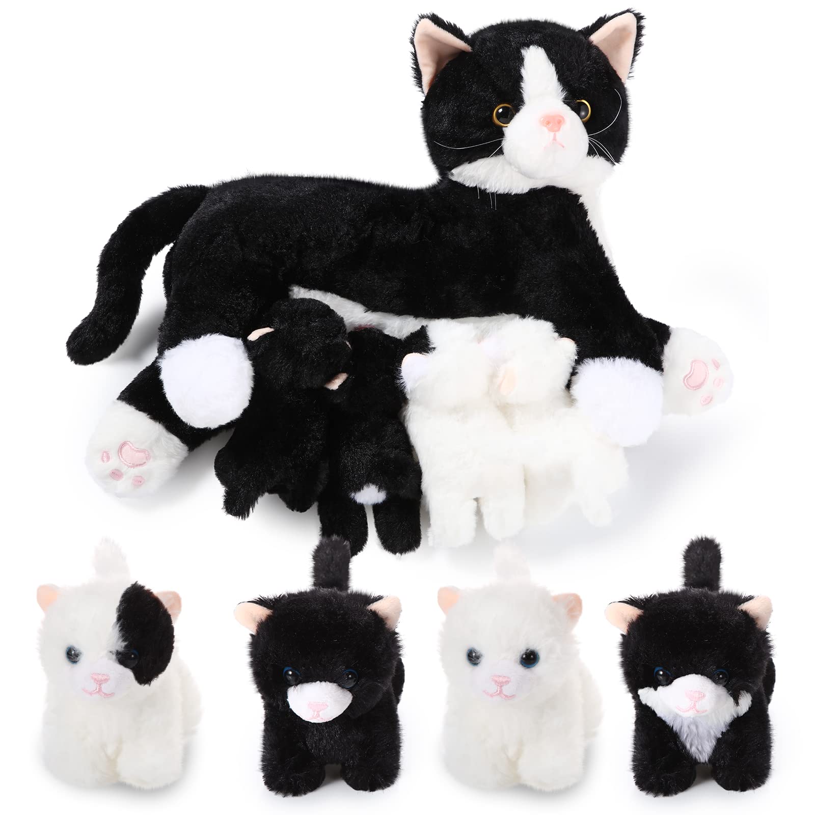 Skylety Nurturing Cat Stuffed Animal With Plush Kittens, Valentine Cat Baby Stuffed For Girls And Boys Plushy Kitty Mommy Cat With 4 Baby Cats For Birthday Party Favors Gifts(Fluffy Style)