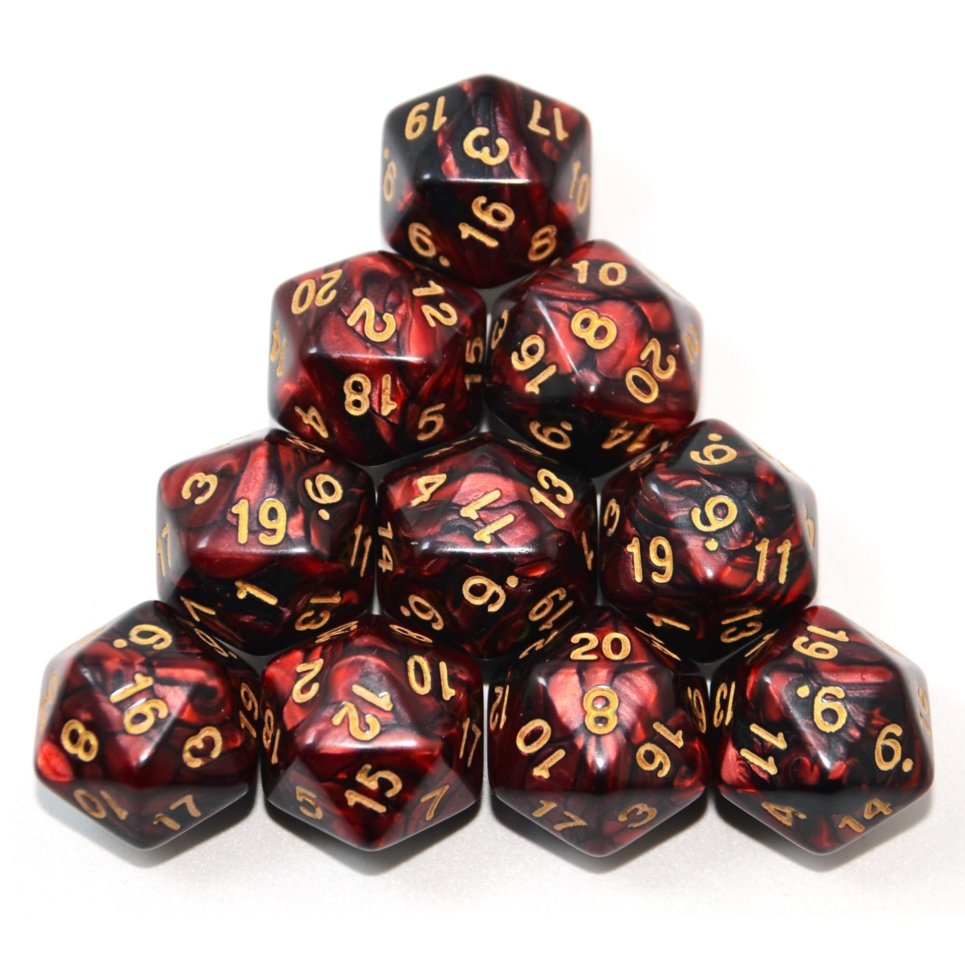 - Q: How many dice are included in this set and what colors can I expect? A: This set includes 10 pieces of D20 dice, featuring random colors that match the images provided, offering a vibrant selection for your tabletop games.