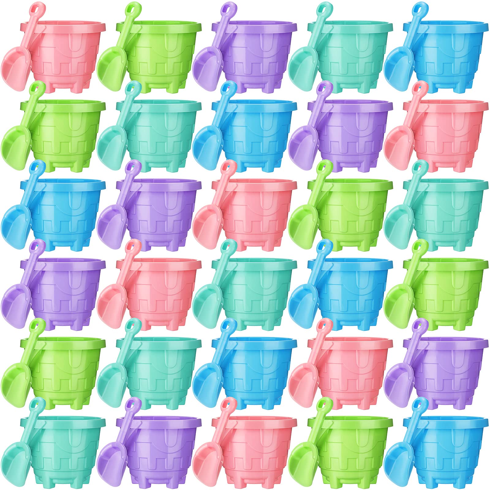 Features: The beach buckets and shovels are suitable as summer party favors for both boys and girls, end of year gifts for students from teacher, and can be applied for goody gift bag and filled with gifts. This plastic beach pail and shovel set is made of plastic material, ensures a long term lifespan and will not hurt hands while playing, safe of children to use. Specifications: Material: plasticColor: pink, sky blue, purple, grass green and mint Size: Sand pail: about 5.5 x 4.7 inch (mouth width x height)Kids shovel: about 7.87 inch in lengthPackage includes: 30 x Sand buckets for kids30 x Sand shovels for kidsNotes: Manual measurement, please allow slight errors on size. The color may exist a slight difference due to different screen displays.