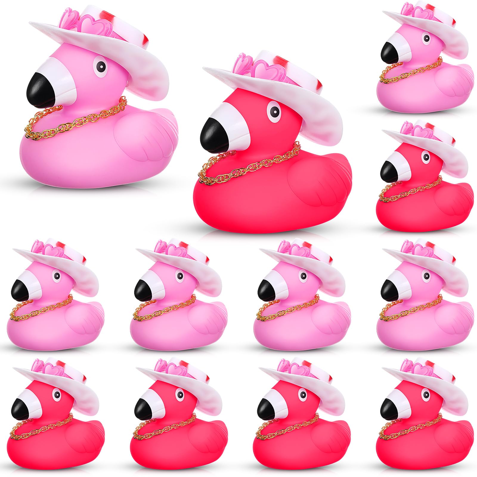 Features: Our bulk rubber ducks serve as party favors for any occasion. Whether it's a fun themed birthday party, a shower, or a Valentine's event, these pink rubber ducks will surely stand out. More than flamingo decorations, these flamingo ducks are interactive that produce an endearing squeak when squeezed. Specifications: Material: rubber Color of flamingos: hot pink, pink Size: approx. 2.17 x 2.17 x 2.36 inches/ 5.5 x 5.5 x 6 cm Package includes: 12 x Flamingo rubber duckies 12 x Western hats for mini ducks 12 x Heart sunglasses for mini ducks 12 x Necklaces for mini ducks 12 x Double side tape Notes: Manual measurement, please allow slight errors on size. The color may exist a slight difference due to different screen displays.
