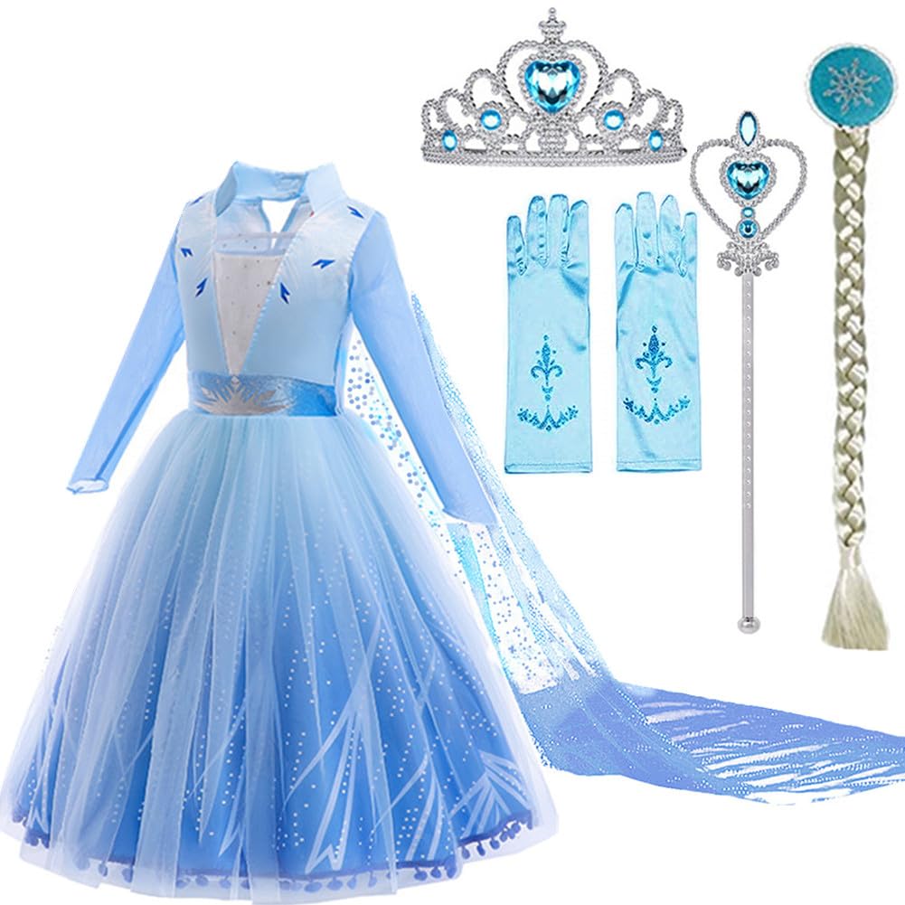Package include :Elsa costume + 1 tiara +1 wig+1 wand +1 pair of gloves | Design:many shining rhinestones decorated neck ,sleeves and bust,a very big snowflake rhinestone decorated on bust,and we designed a layer of shining mesh on top layer of skirt,long cape which is full decorated with sparkle dots ,very amazing elsa princess dress,your girl will definitely love this beautiful shining dress | Fabric:the inner is pure cotton ,it is very soft and breathable,and the long cape is made of soft mesh,the skirt inside is made of soft blue satin | Occasion:Perfect for birthday party, dress up, halloween, role play, pageants,,christmas (Xmas) holidays and special occasions | hand wash recommended