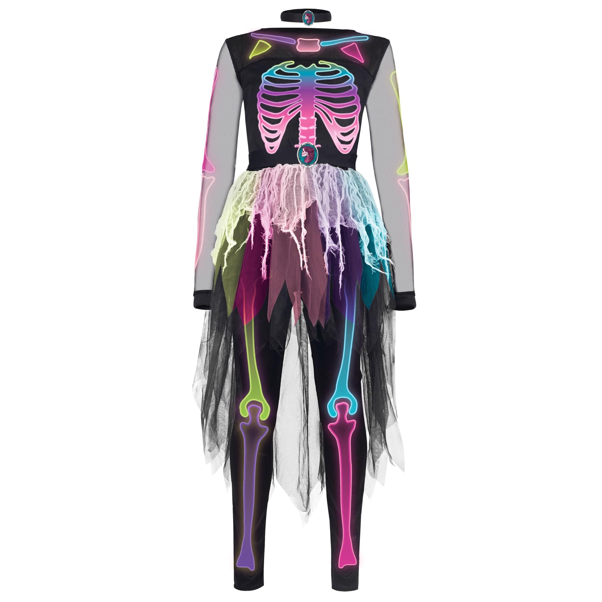 - Q: What does the Funky Skeleton Tutu Dress set include? A: The costume set includes a neon color girl skeleton dress, a belt, a pair of leggings, and a choker, allowing your girl to fully embrace her funky and spooky side.