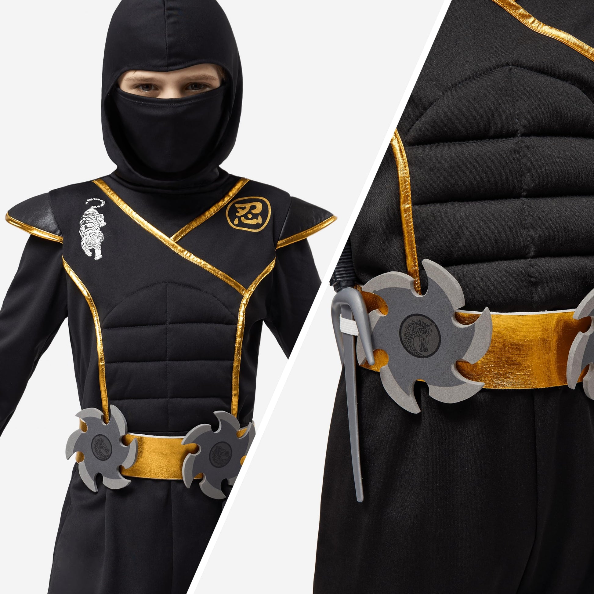 Why Not Dress Up Your Kiddo as a Cool Gold Ninja to Have Fun this Halloween? Spooktacular Creation Deluxe Gold Ninja Costume Set with Ninja Kids Outfit and Ninja Accessories.15 PCS Halloween Ninja Costume for Boys and Girls Includes 1Ninja Gold Jumpsuit with Attached Hood 1 Ninja Face Mask 1Belt 1 pair of Ninja Gloves 2 Toy Claws 2 Foam Ninja Daggers and other 7 foam accessories.Role-Paying Ninja Kid Kung Fu Uniform. Super Durable. Higher Quality. 100% Polyester. Ideal for Role Play. Suit for Halloween dress-up parties festivals theme party costumes ninja party costume ninja role-playing trick or treat costume theater plays pretend play outdoor activity Theme Party Costumes Halloween Costume Photo Shoot Play period every day and more. The costume is soft comfortable and easy to move around in. Size: Our ninja costume is designed for kids and available in three sizes (Small ( 5 - 7 yrs) Medium ( 8 - 10 yrs) and Large ( 10 - 12 yrs) ) which is suitable for children of different ages and ensures a great fit. Please refer to the size chart for accurate measurements.