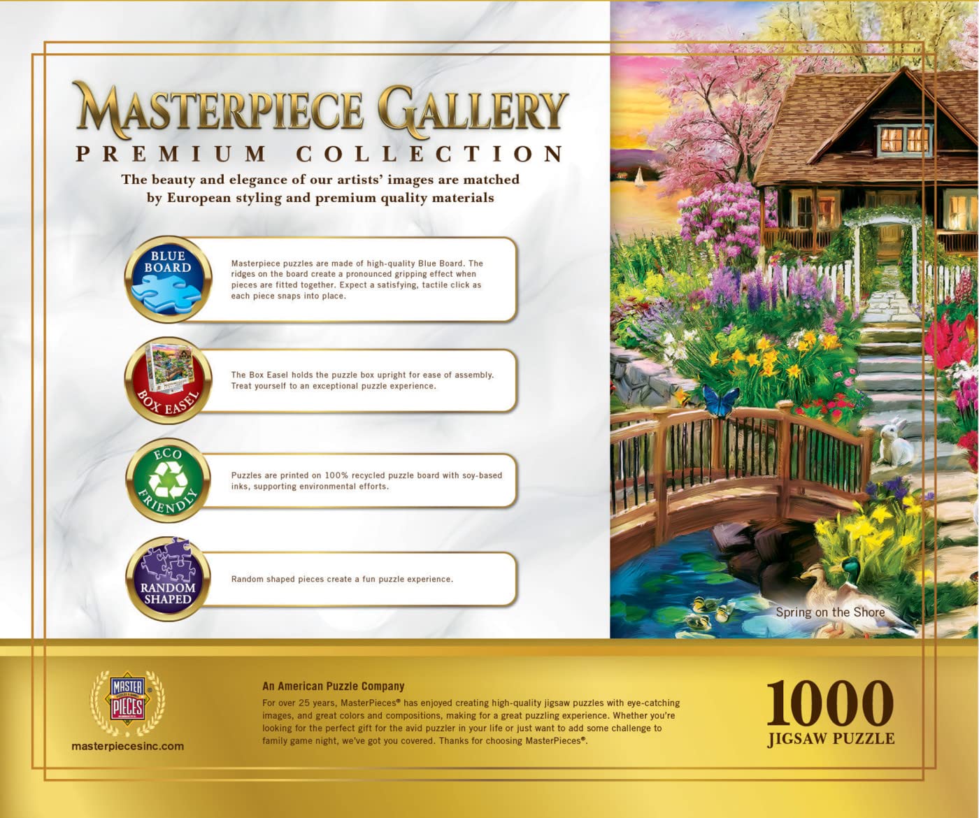 This Masterpieces 1000pc Puzzle of colorful blooms on a babbling brook in springtime near the shore is made on the highest quality recycled blue board and printed on linen paper for a shine-free easy-to-grip image and packaged in sophisticated linen-finish display boxes.