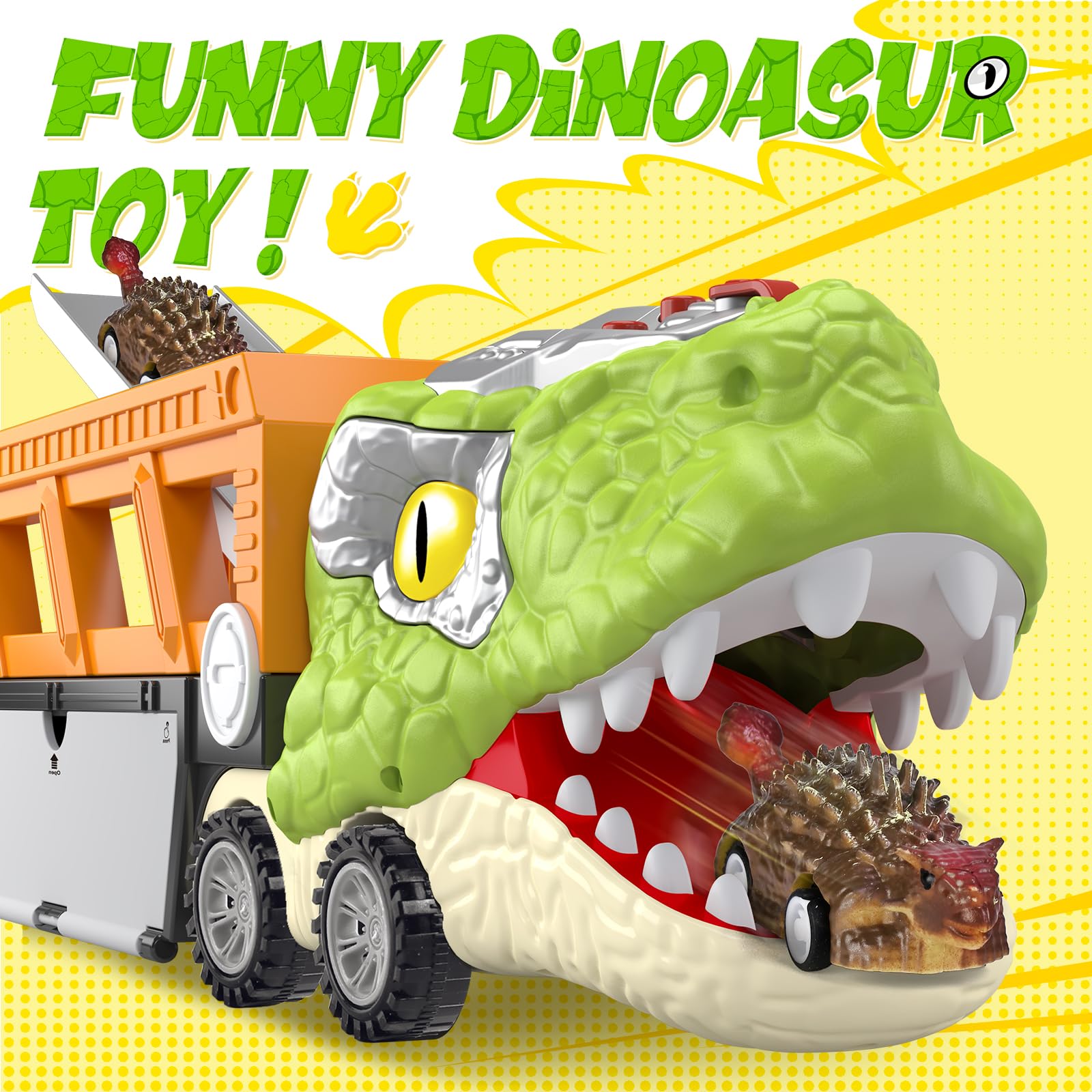 • Q: What features does the dinosaur truck offer? A: The dinosaur truck includes a sound button, lights, and a spray function that adds an interactive element to playtime. It also has storage space for the dinosaur cars.