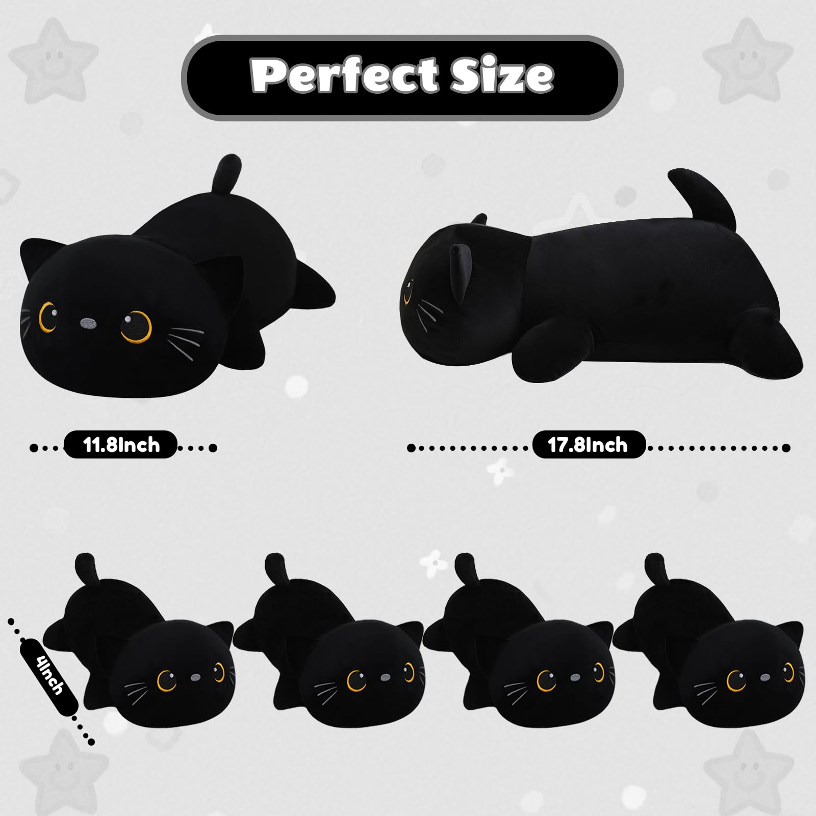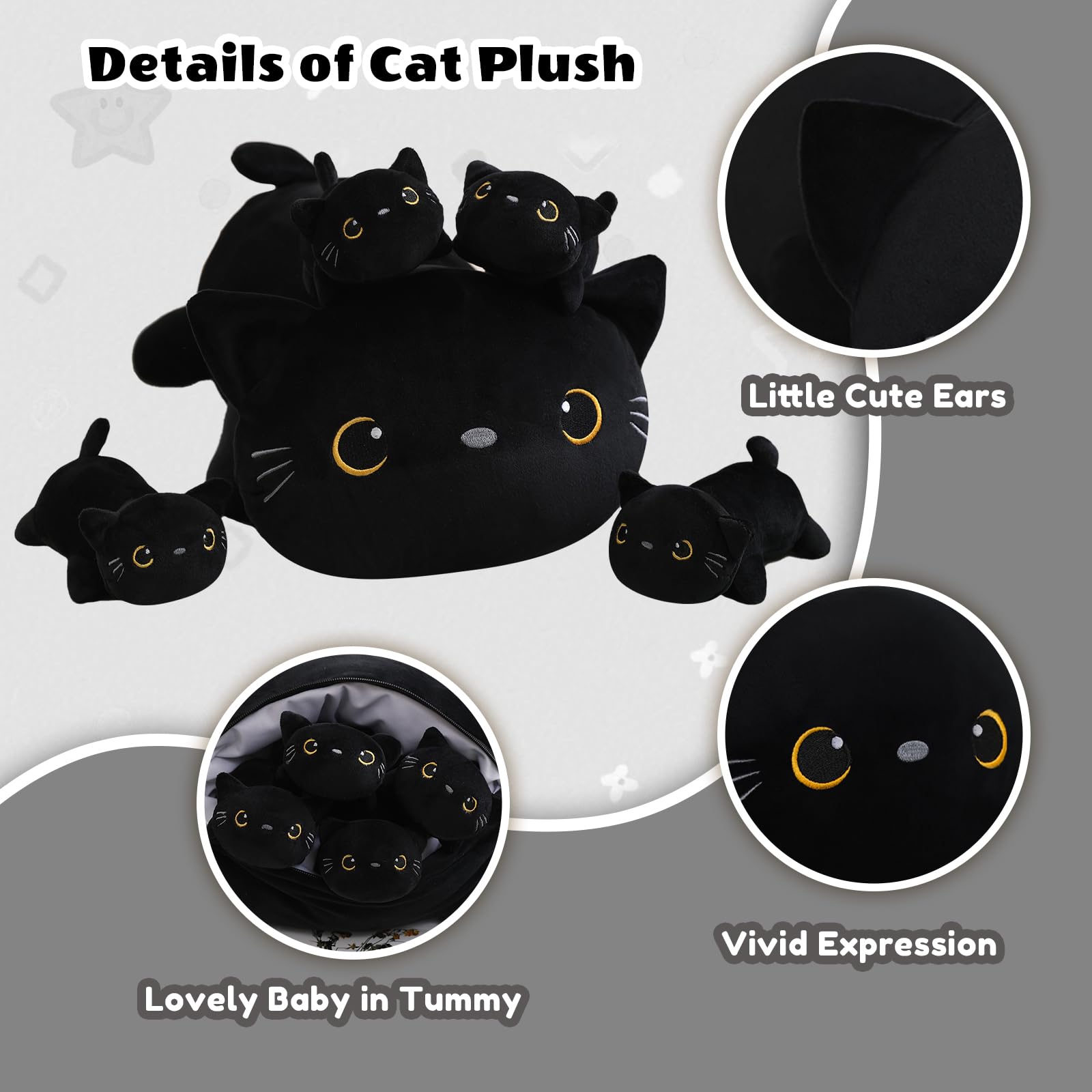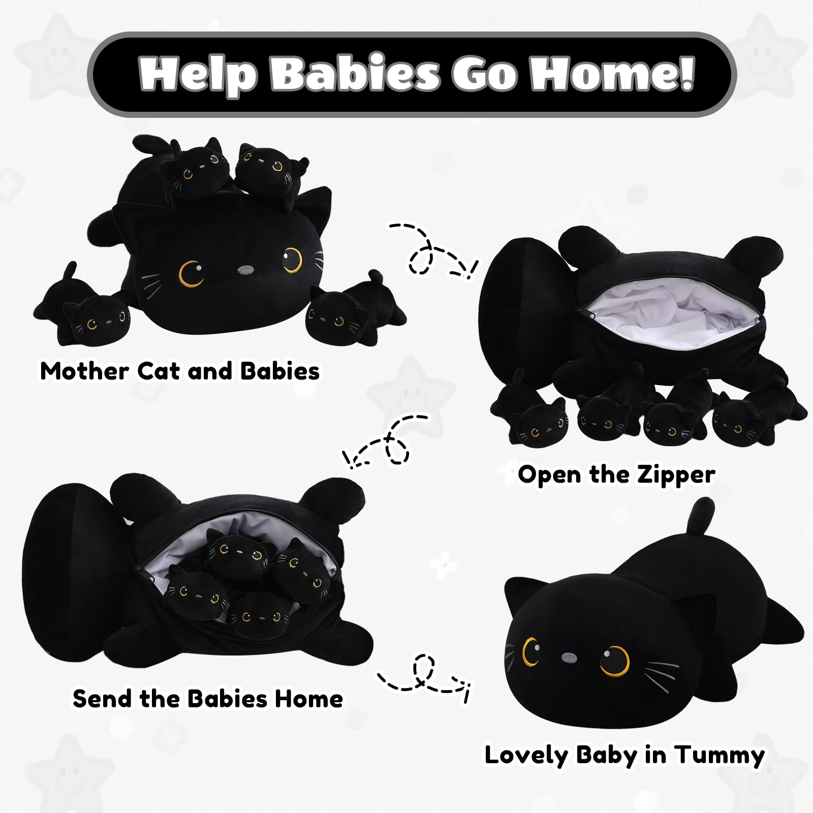 Sqeqe Black Cat Mommy Stuffed Animal With 4 Babies Cat In Her Tummy, Cute Black Cat Plush Toys For Kids, Gifts Ideal For Christm