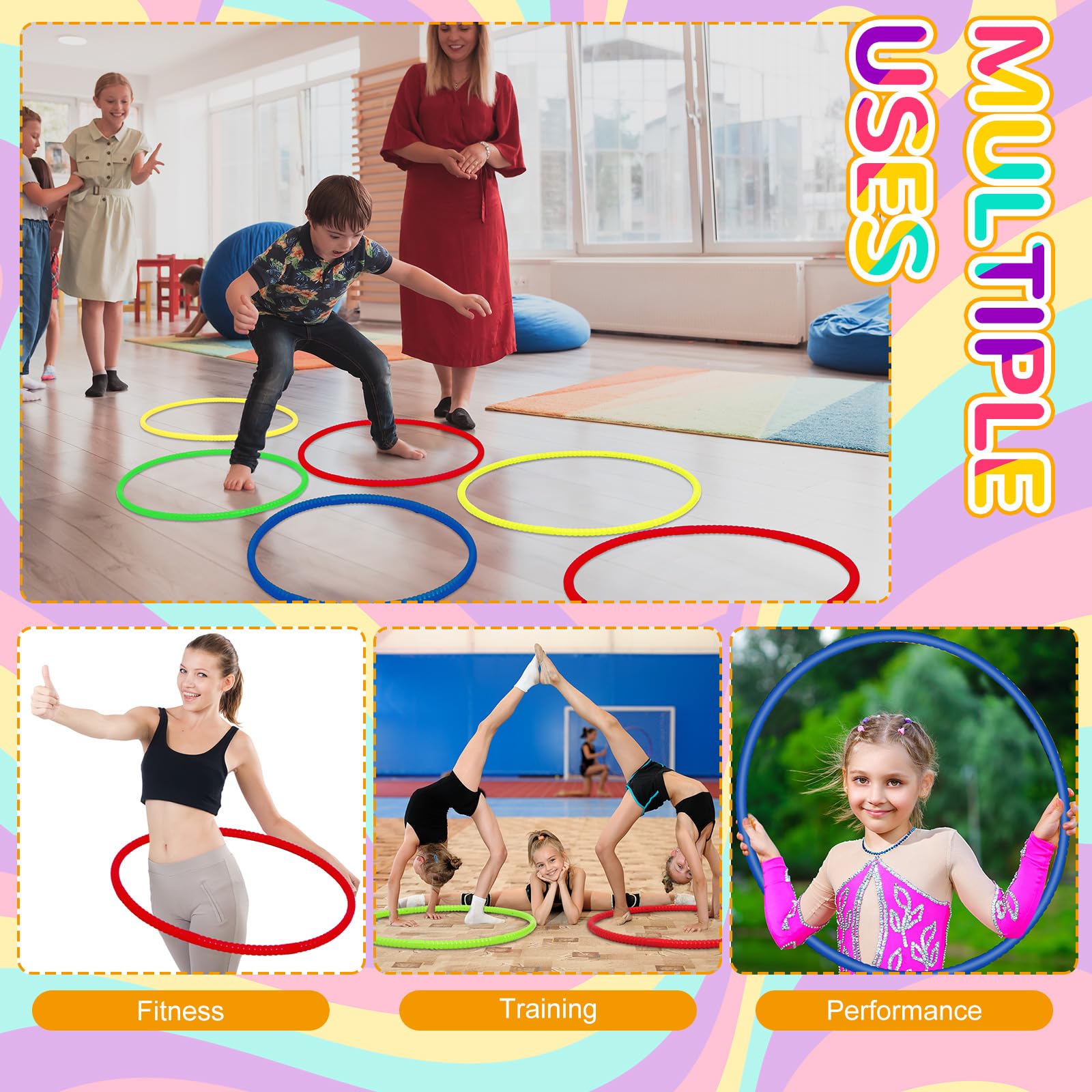 Features: Wide range of applications: These rings for teens are suitable for various uses, such as school sports events, party game supplies, garland decorations, exercise toys, and more. They can be played with indoors or outdoors, providing entertainment for all kinds of settings and activities. Ideal gifts: These dog hoops jump make excellent gifts for teens and hoop enthusiasts. The bright colors, sturdy construction, and versatility of these toys make them a thoughtful and enjoyable present for birthdays, holidays, or any special occasion. Specifications: Material: plastic Bright colors/ yellow, green, royal blue, red Size: about 28 inches Quantity: 8 Package includes: 8 x Adjustable hoop plastic toys Notes: Manual measurement, please allow slight errors on size. The color may exist a slight difference due to different screen displays. Please read the size instruction carefully before purchasing. Suit to people over 12 years old.
