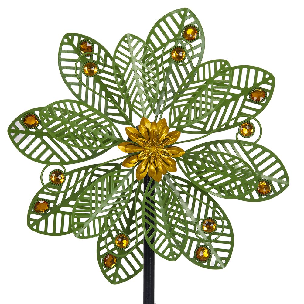 Special Design:The metal wind spinner featuring a hollowed-out double leaf design,bright green color bring a fresh and natural feeling, add a touch of ambience to your garden | Flexible Rotation:Superb welding technology provides the metal wind spinner with smoothly rotating and it rotates easily with just a little breeze in any direction | High Quality:The metal garden spinner is made of durable metal, bright and long-lasting anti-rust paint. Four-pronged base is stable under heavy winds ,suitable for most weather | Easy Assembly:Without any tools, you just need to connect several tubes and then push the bottom pile into the soil and get your wind spinner up and spinning in a matter of minutes | Outdoor Decoration:The metal wind spinner is suitable for outdoor decoration such as yard, patio, lawn ,pathway etc. The pinwheel decor is also great for your family or friends as a gardening gift