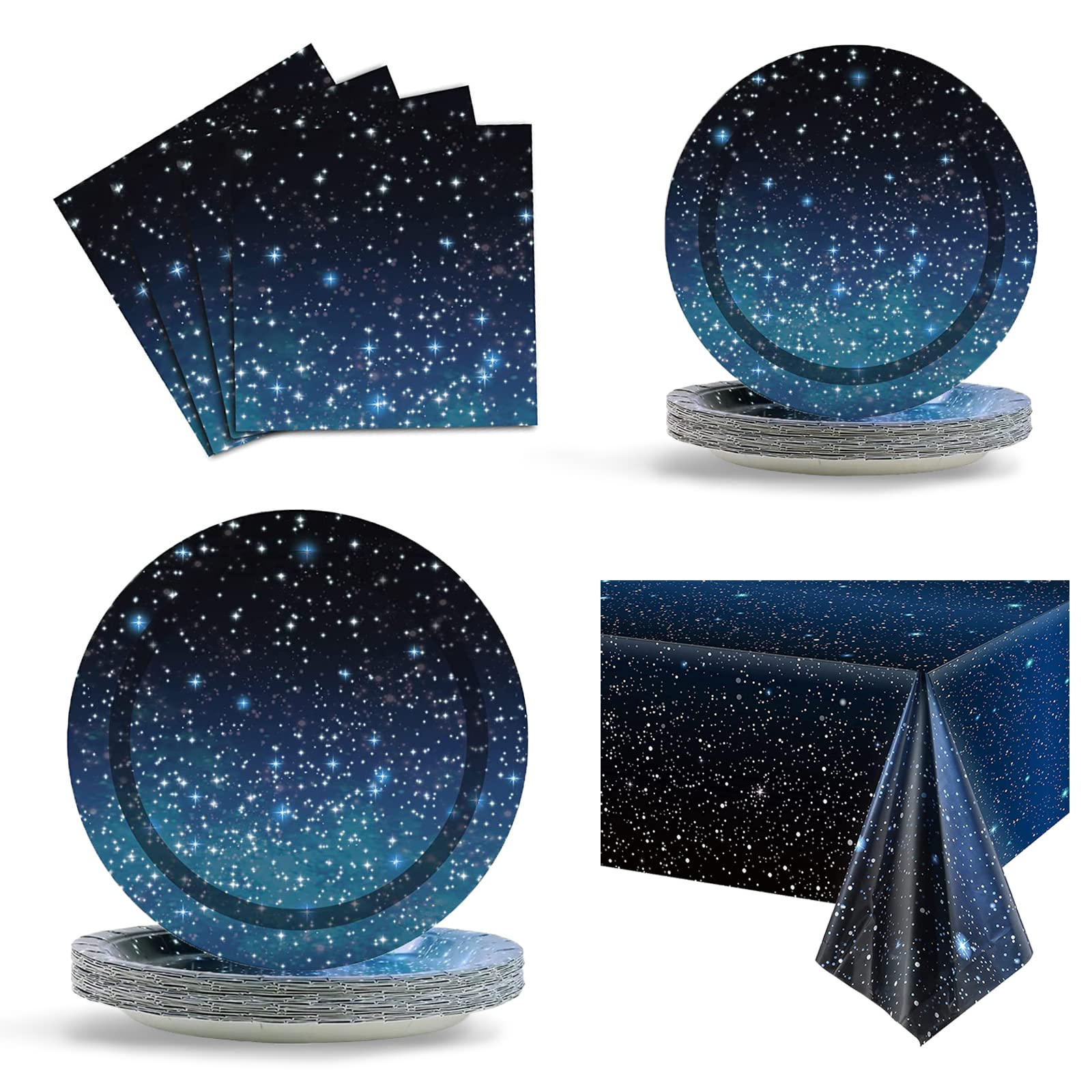 - Q: What items are included in the Starry Galaxy Party Supplies set? A: The Starry Galaxy Party Supplies set includes 25 paper galaxy plates (9 inches), 25 space dessert plates (7 inches), 25 galaxy napkins (6.5 inches), and 1 galaxy tablecloth (54 x 108 inches), making it perfect for serving 25 guests at your party.
