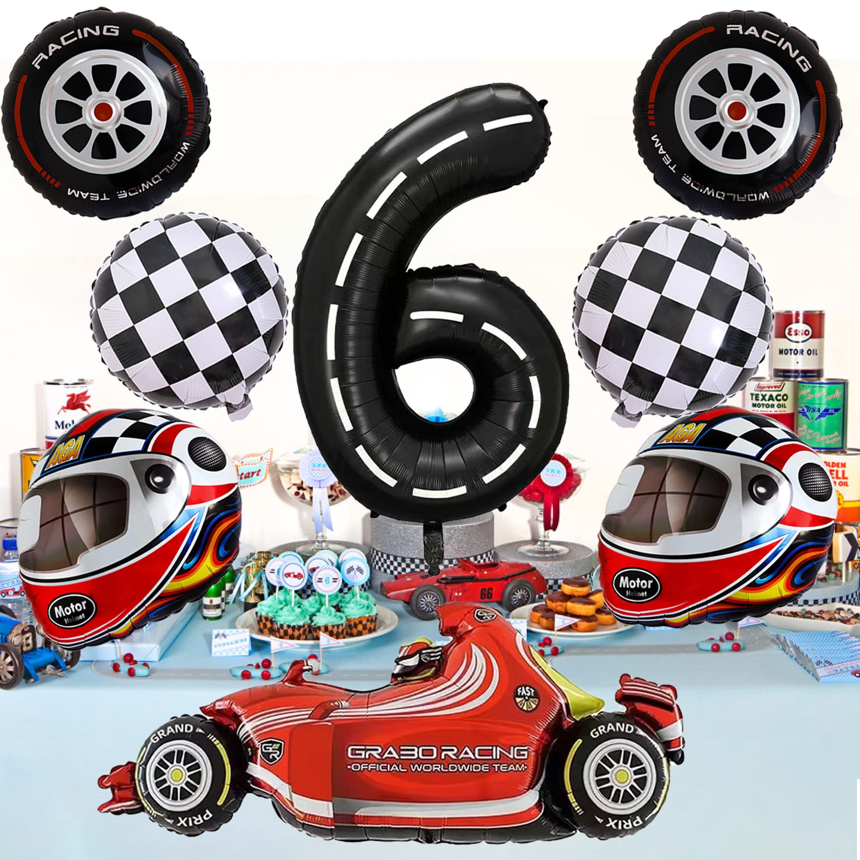 Stcomart 8 Pcs Race Car Party Decorations, Black Number 6 Balloon Checkered Balloons Tire Balloons For Boys 6Th Birthday