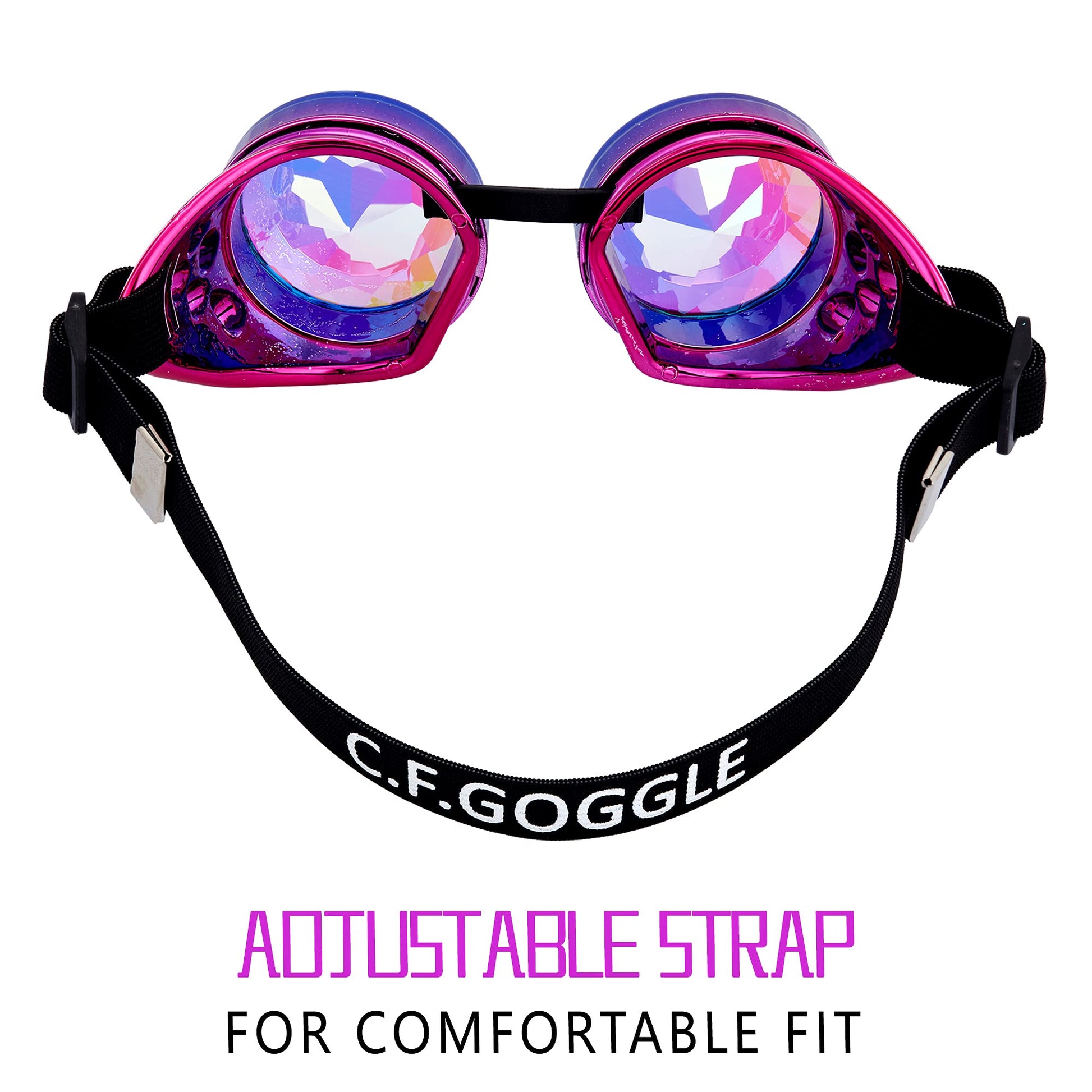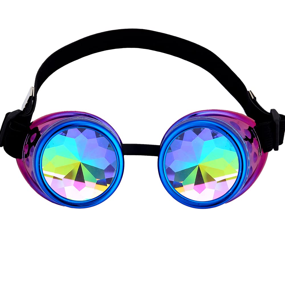 Product Description - High quality chrome plated plastic frame, safe and comfortable to wear. Steampunk goggles with rainbow crystal glass lens, Brightly colored and radiant. | Fit Everyone - The adjustable elastic headband makes it easy for everyone to wear. And it's very stable and won't fall. | Interesting and Distinctive- The lens will appear different colors in different angles,making it like kaleidoscope. In the crazy time of some festivals, it is a necessary tool for people to cosplay and take pictures | Wide Versatlity - Kaleidoscope Steampunk Goggles perfect for fantasy and fun. Perfect for Christmas Day, Halloween, Cosplay, Dance Party, Convert, Music Festival,EDM,Light Show,Photo Prop,Outdoor Sports or etc. | Warm Hint - This kaleidoscope goggles will have a little chromatic aberration because of the angle of the picture and the difference of screen.