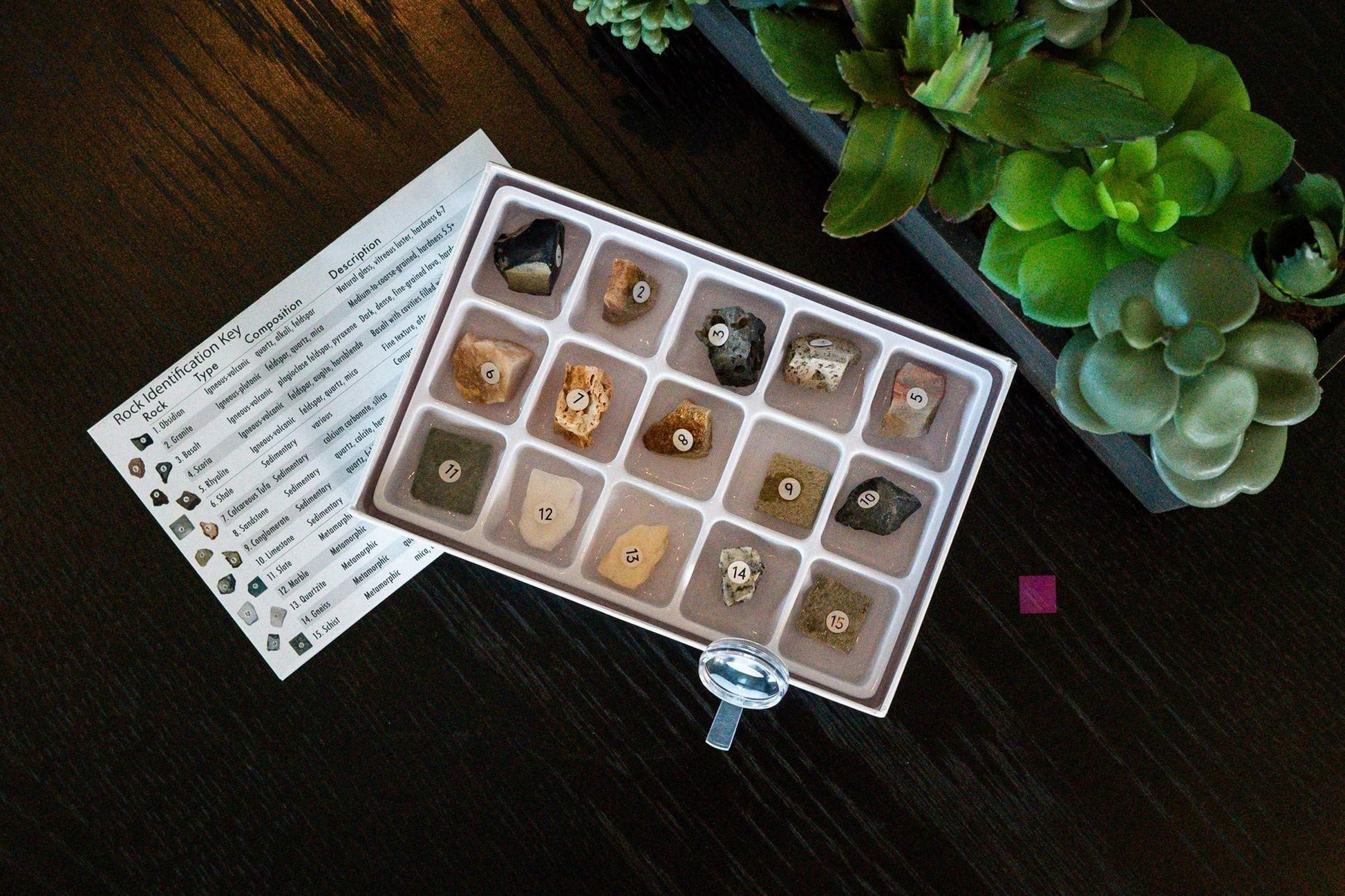 - Q: What does the Rock Science Kit include? A: The kit includes fifteen (15) rock specimens, a magnifying viewer, and a handy identification guide to help children learn how to test, classify, and identify different kinds of rocks.