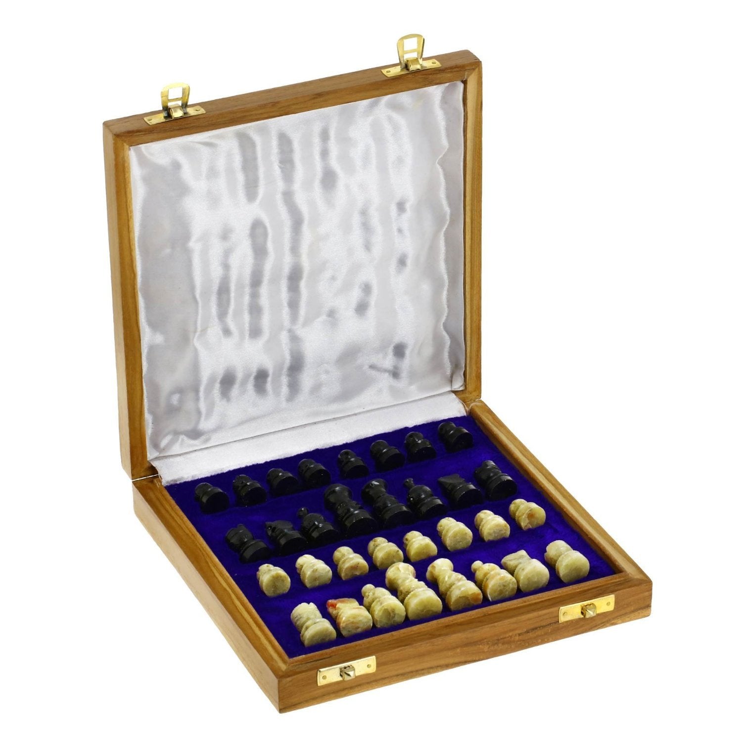 Handcrafted Chess Board made on Stone, Pieces are also made of Brown/Black Stone. Hand carved Indian stone chess set. Size of the King is almost 1.5' high for Chess Board of 8' x 8'. The main colors of stone used on this chess set are white and dark gray. Board is also decorated with wood inlays. Pawns are of Black colored natural stone and Brown natural stone. All pieces are hand carved. Chess Set itself is having storage for all of it 32 pawns and is laced with satin feel cloth. As it can be seen in picture, Main Box is Wooden and Stone Inlays have been placed on top of the wooden box. Please note that actual product might have some natural stone vein, minor color and/or shade differences compared to the picture.
