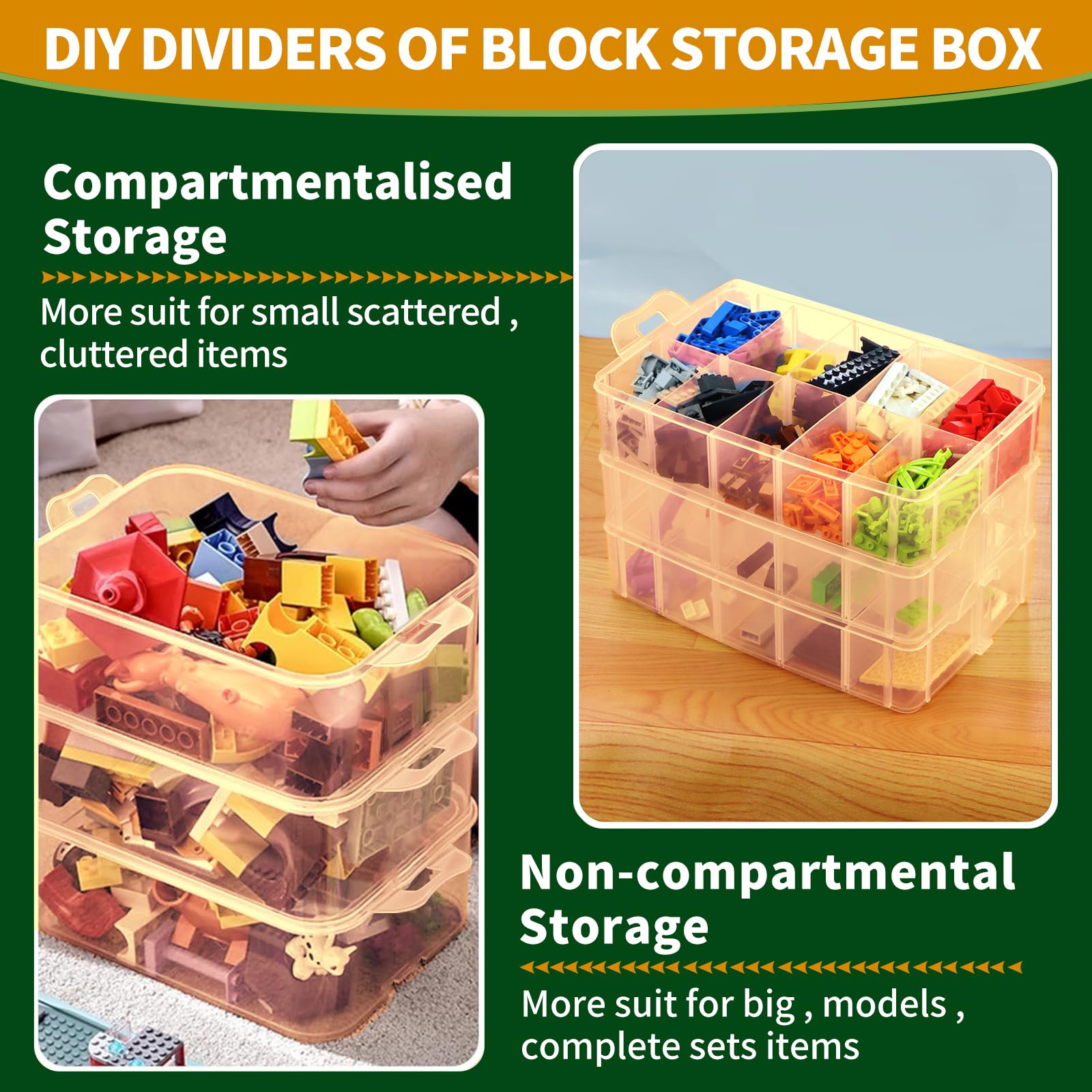 - Q: Can I customize the compartments in the storage box? A: Absolutely! The Storage Box for Lego comes with 30 adjustable compartments that can be customized to fit different toy sizes. This feature allows you to create personalized spaces, making organization easier.