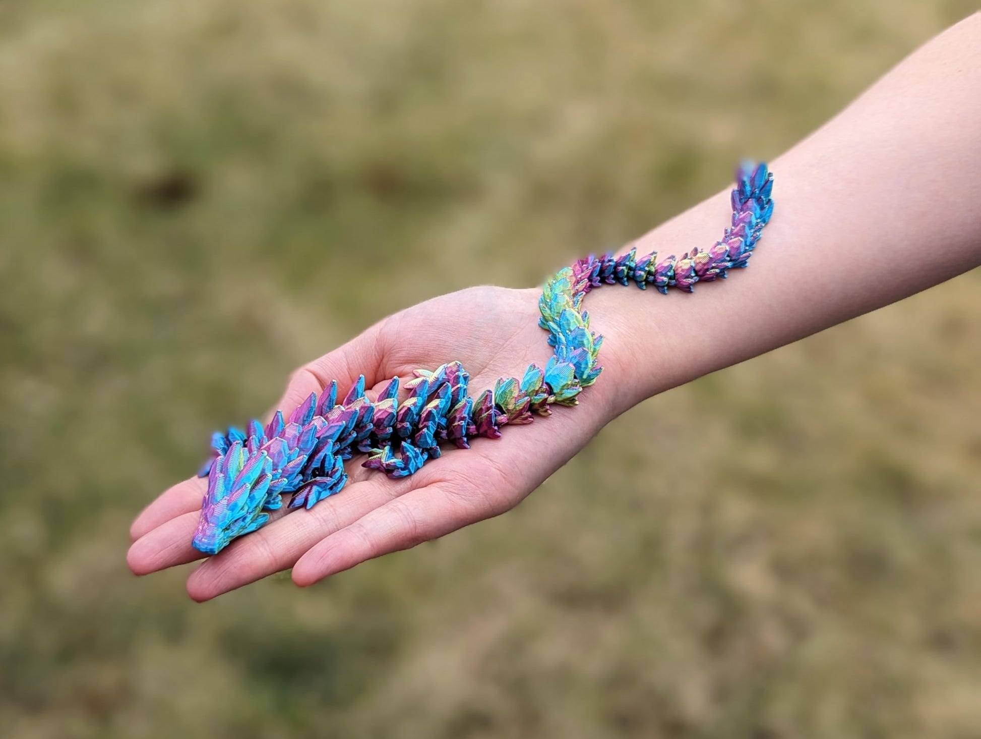 Adopt your own gem stone dragon! These dragons are made out of many interlocked pieces which make them flexible, bendy, and fully articulated.These dragons are crafted with a beautiful silky, glossy finish. Each dragon is created with multiple colors, so the color of the dragon is different depending on which angle you view it at! Please check out the video to see how the colors look!