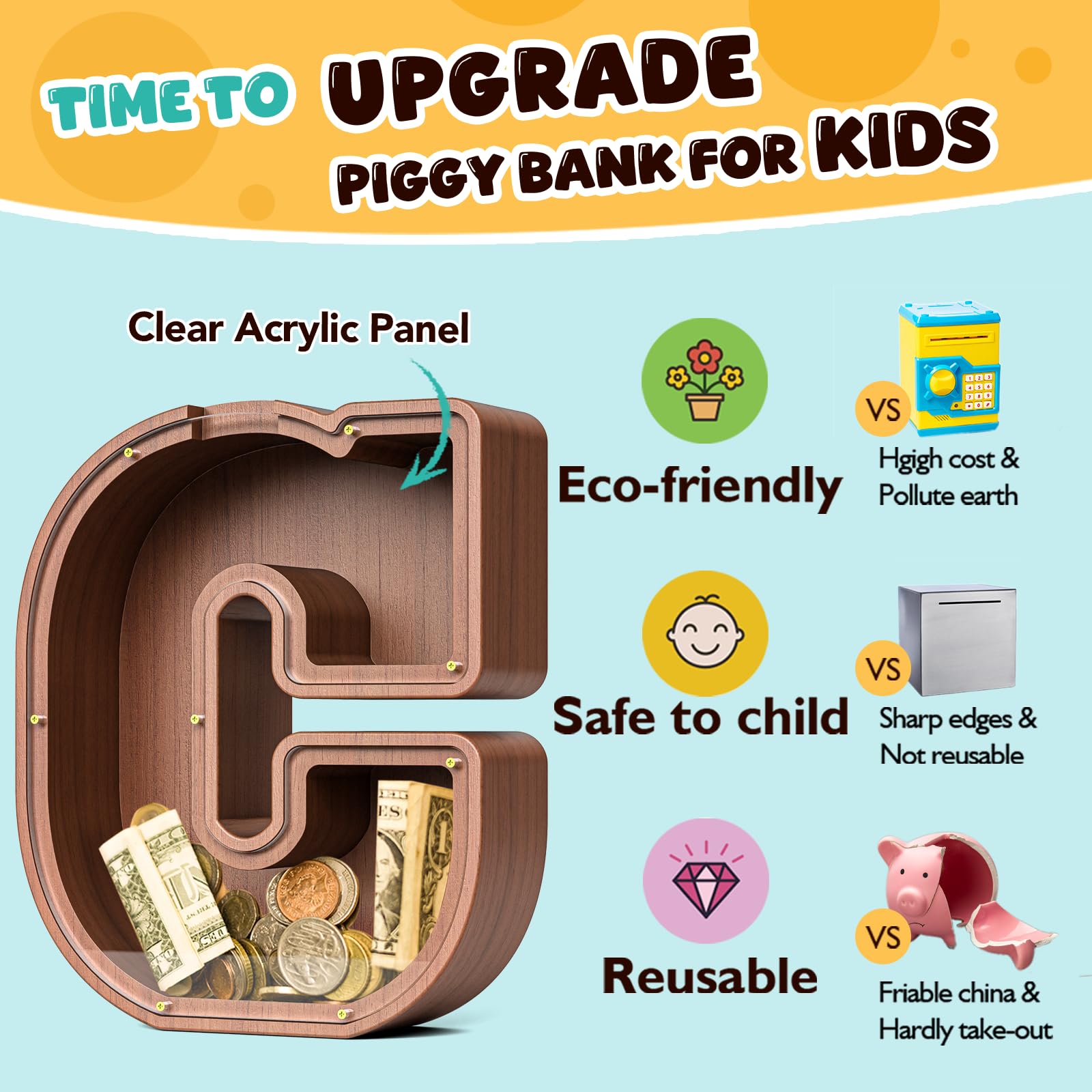 ?enhanced Quality & Craftsmanship?Our wood piggy bank Made of 100% organic wood with natural oil finishing smooth and durable. Carefully polished multiple times to ensure no burrs or rough edges.The extra thick size of this letter bank is 9.1x1.6 inch big enough to hold both coins and cash while staying stable on any surface. | ? Montessori Educational Toy?Clear acrylic piggy bank allows kids to see their savings grow encouraging financial awareness responsibility and the joy of progress from an early age.The included letter stickers can be used to DIY your child 's own piggy bank | ?Unique Design?Stylish as a bookshelf decor living room ornament makes it suitable not only as a wood letter bank but also as decoration wedding card box keepspirit-inspired flavor that can be used for years. Unscrew for hassle-free access to savings | ?Perfect & Meaningful Gift?Ideal for birthdays baby showers Christmas Easter or back-to-school surprises. A timeless and practical present for kids and families. | ?Reliable After-Sales Support?We provide prompt customer service and offer personalization options. Your satisfaction and your child