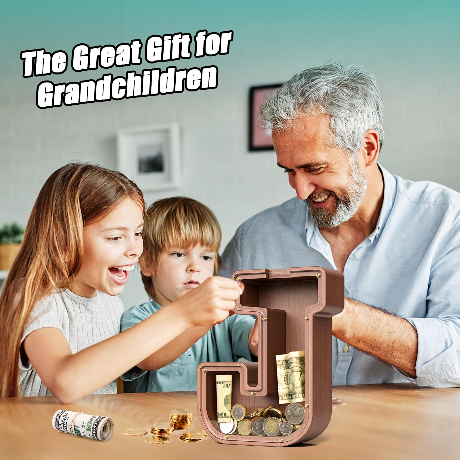 Summidate Wooden Letter Piggy Bank Extra Thick Large Capacity Piggy Bank for Kids Boys Girls Toddler Alphabet J Money Bank| Coin Box Birthday Christmas Festival
