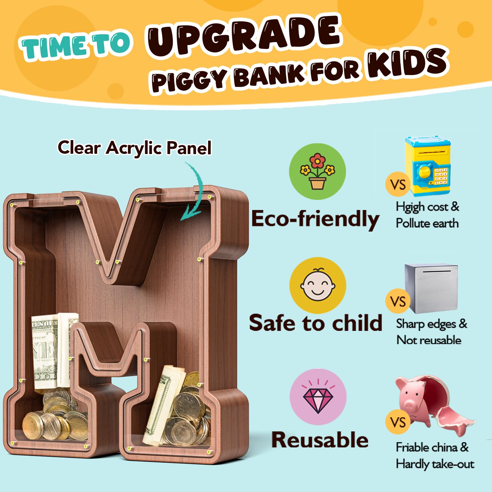 ?enhanced Quality & Craftsmanship?Our wood piggy bank Made of 100% organic wood with natural oil finishing smooth and durable. Carefully polished multiple times to ensure no burrs or rough edges.The extra thick size of this letter bank is 9.1x1.6 inch big enough to hold both coins and cash while staying stable on any surface. | ? Montessori Educational Toy?Clear acrylic piggy bank allows kids to see their savings grow encouraging financial awareness responsibility and the joy of progress from an early age.The included letter stickers can be used to DIY your child 's own piggy bank | ?Unique Design?Stylish as a bookshelf decor living room ornament makes it suitable not only as a wood letter bank but also as decoration wedding card box keepspirit-inspired flavor that can be used for years. Unscrew for hassle-free access to savings | ?Perfect & Meaningful Gift?Ideal for birthdays baby showers Christmas Easter or back-to-school surprises. A timeless and practical present for kids and families. | ?Reliable After-Sales Support?We provide prompt customer service and offer personalization options. Your satisfaction and your child