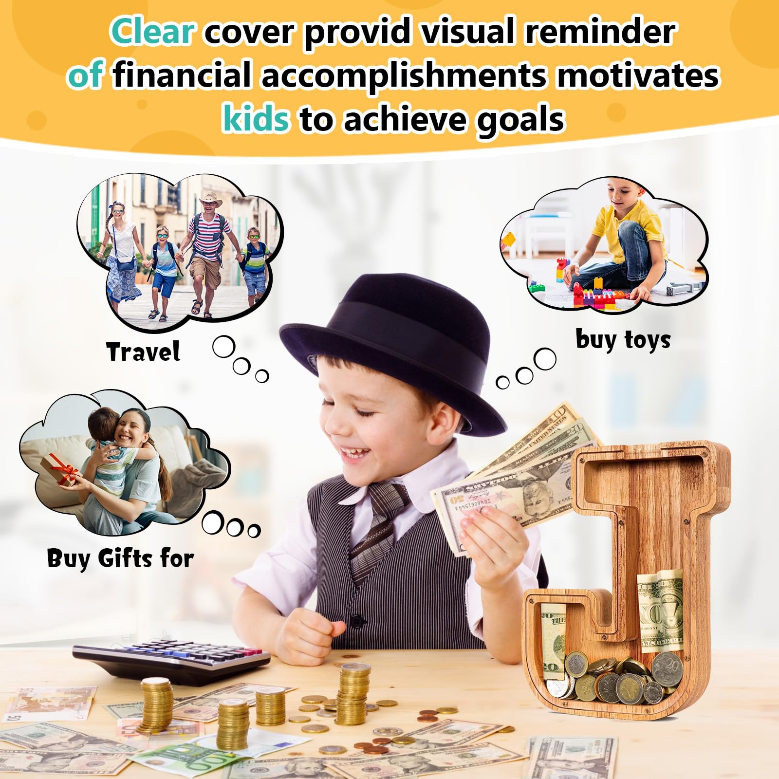 SummiDate Wooden Letter Piggy Bank| Piggy Bank for Boys Girls Toddler| Alphabet J Money Bank| Coin Bank Birthday Gift for Kids|Birthday Easter Gifts for Kids (J)